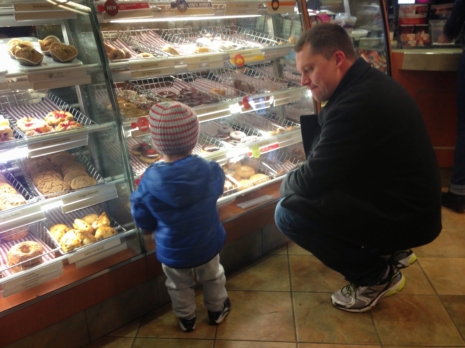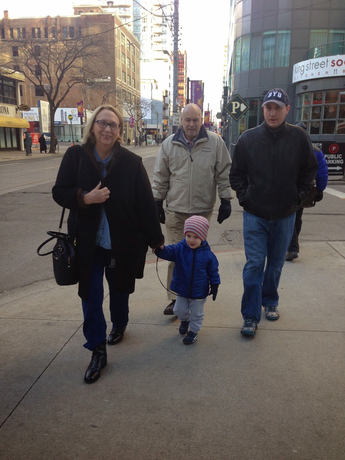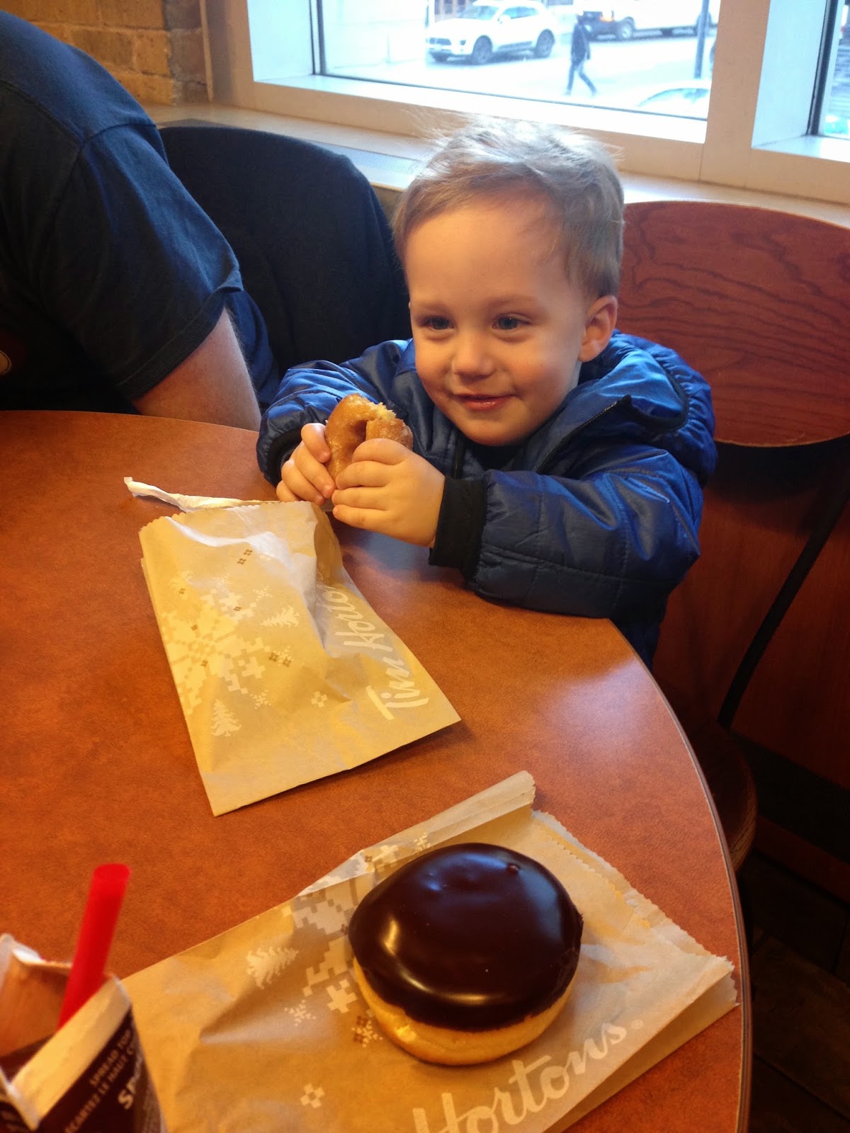 Friday morning, the big day! We started the morning by walking a few blocks to get some Tim Horton's for breakfast. We were looking forward to Noah having his first Timbits (like munchkins). However, it was a normal working Friday for Toronto and we were down in the Financial District. The place was super busy and they were out of Timbits and said it would take 30 minutes for more! We picked some donuts out of the limited selection that was left, but Noah didn't seem to care :)
