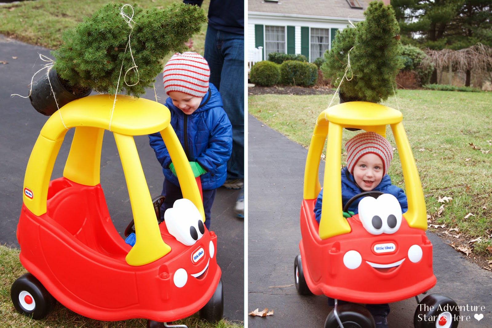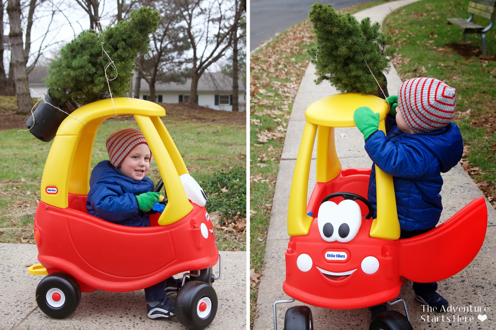 I'm sure many of you have seen a few variations of this picture on Pinterest. I've wanted to do something like this with Noah ever since he got the Little Tikes car for his birthday. We finally did it this weekend and Noah thought it was pretty funny to have a tree tied to the top of his car :)