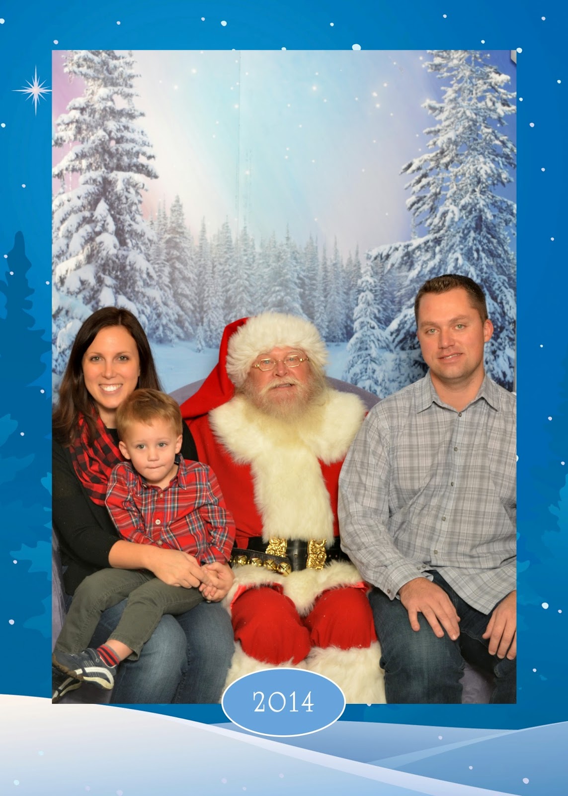 We went to our local mall the Wednesday before Thanksgiving to go see Santa.  We figured that since it was snowing that the line wouldn't be that bad... we were wrong.  They also had a whole Frozen set up and a lot of people were there just for that and didn't even care about Santa, but there was only one line for both!  We finally got to Santa, and just as I expected, Noah would not go sit on his lap.  So our visit became a family photo with Santa.  I'm just glad Noah wasn't crying like he was last year!