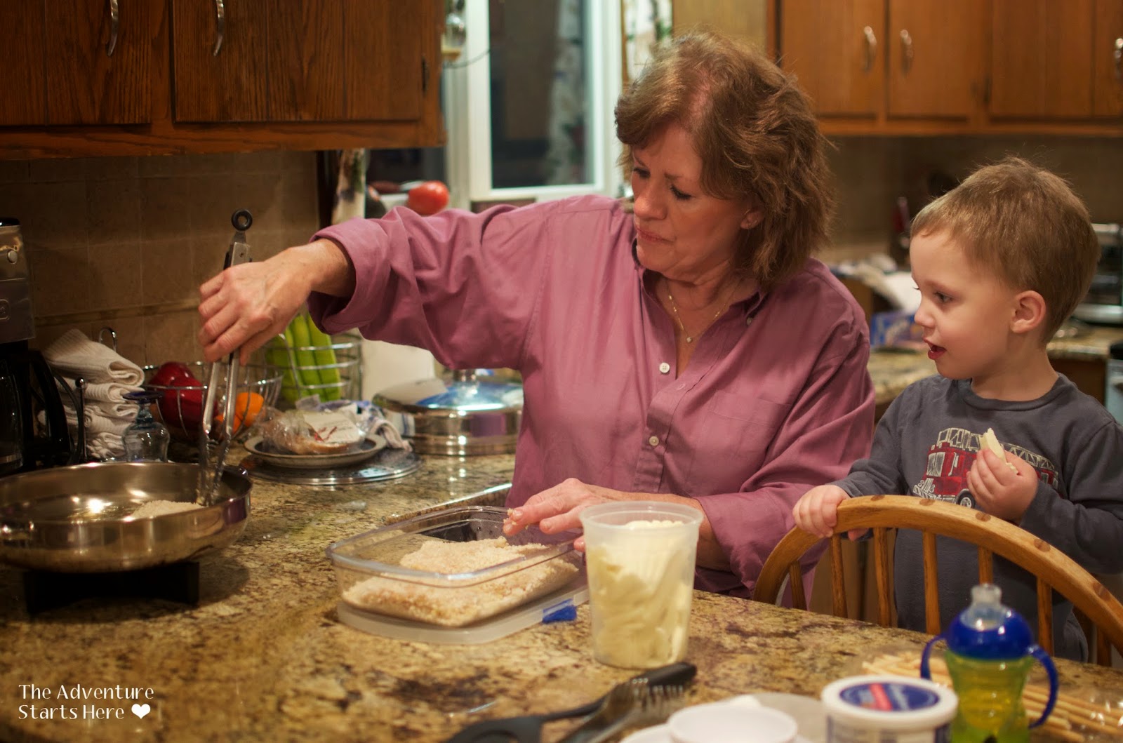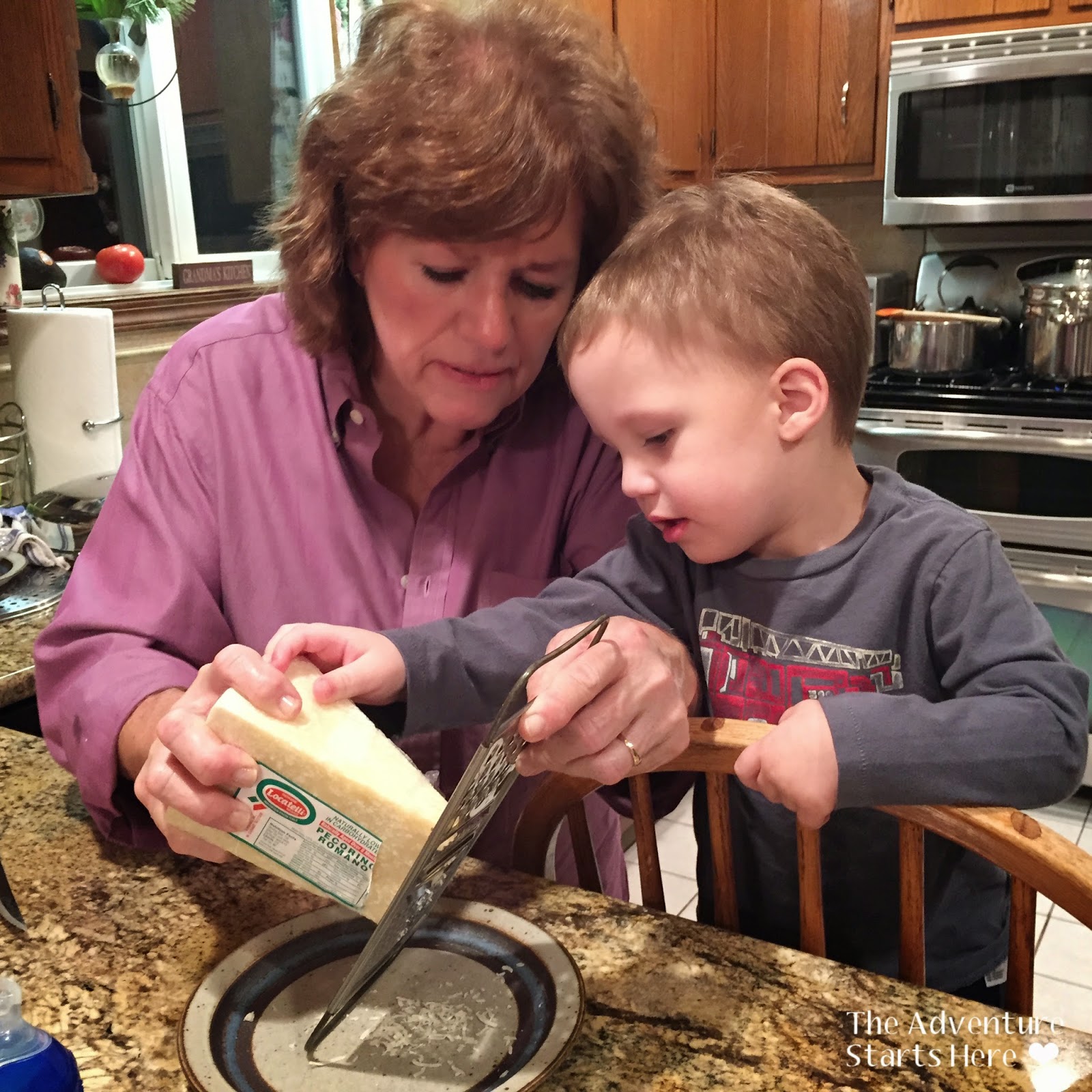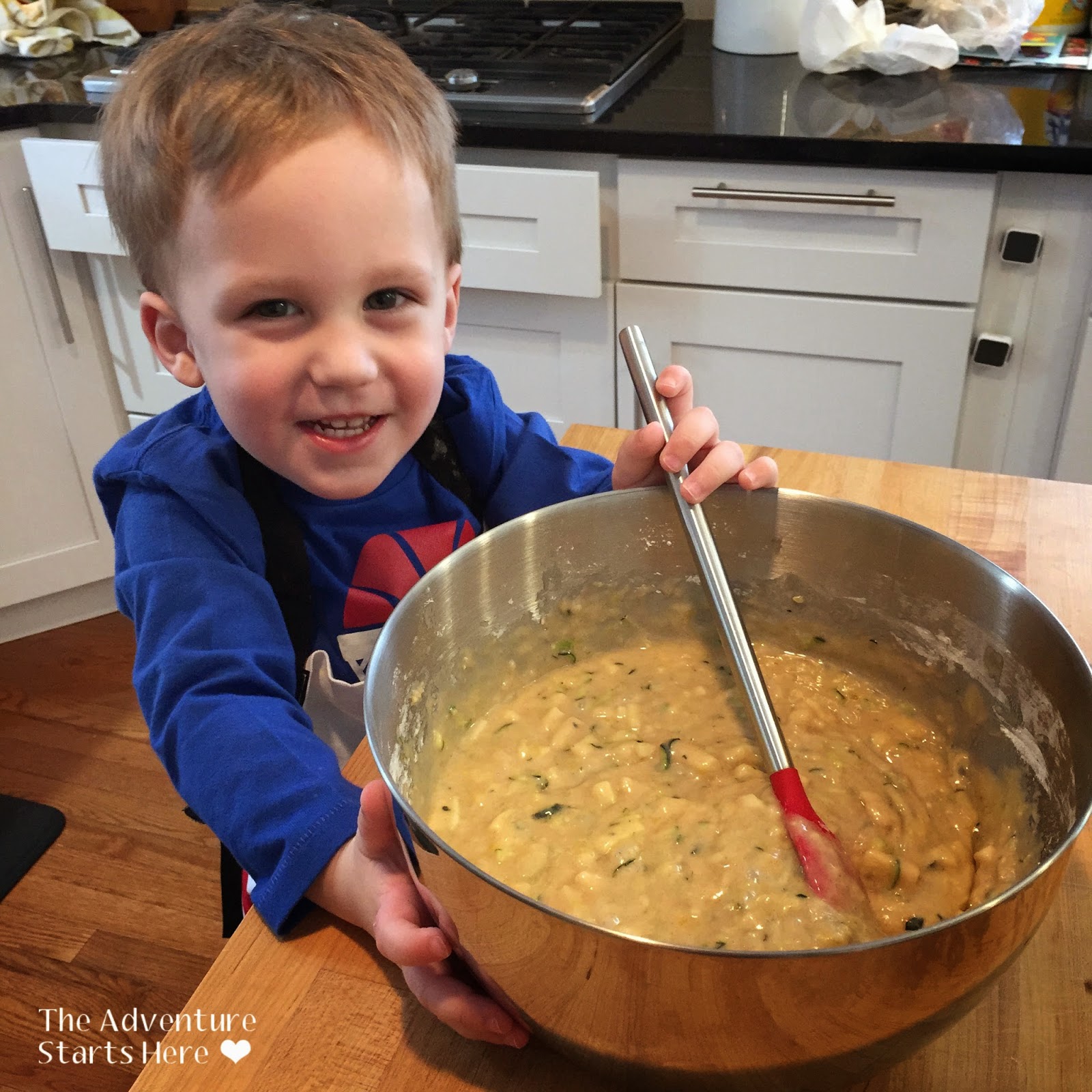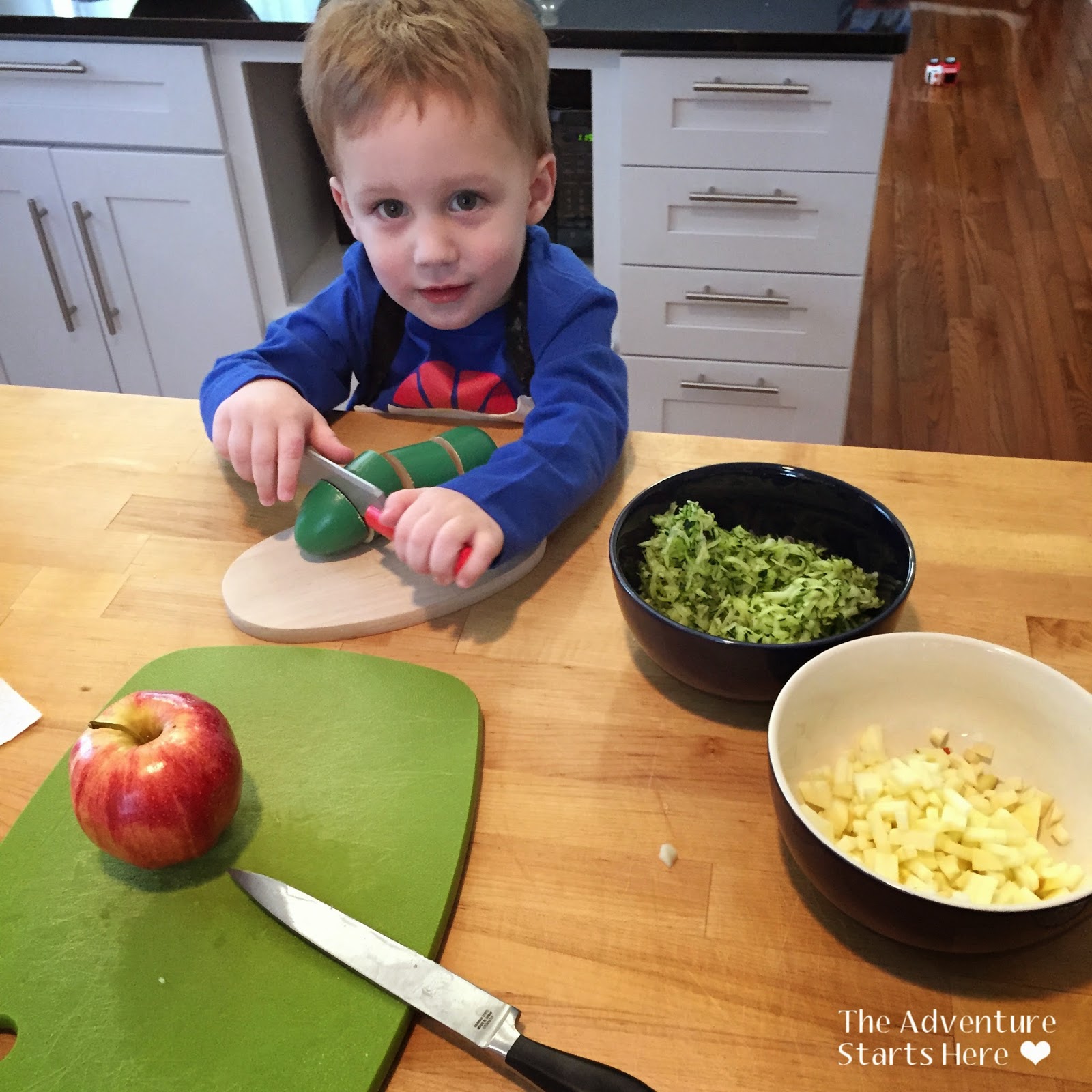 While we technically could have gone out on Tuesday (since the storm really wasn't bad), we decided to take the snow day and do some baking. Noah loves to help me cook and immediately grabs his step stool whenever he sees me start to prepare something. Yesterday, I shared that we made our favorite muffins. Here are some more pictures of Noah helping me. He even grabbed his play cutting board, knife, and zucchini to work along with me :)
