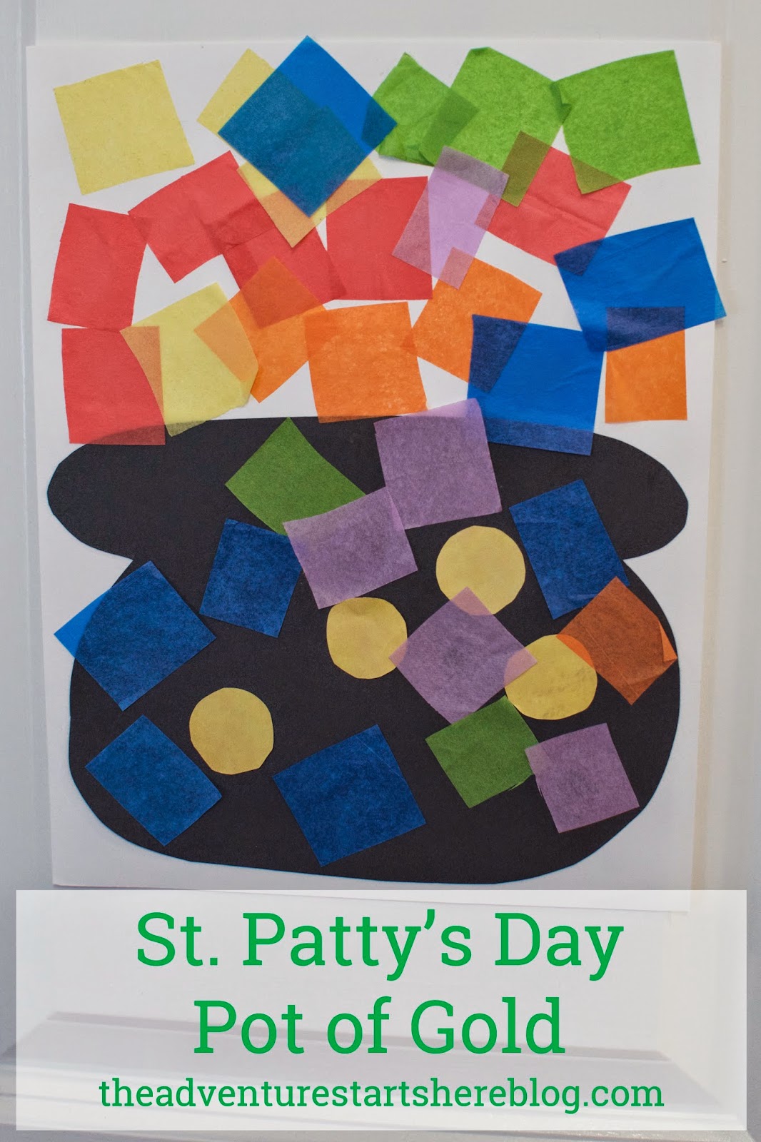 Since St. Patty's Day is next week, I've tried to incorporate a few festive activities in with Noah.  This week we made a Rainbow and Pot of Gold craft that I found on Pinterest.   Since my mom was over that afternoon, she helped Noah while I took pictures.  I think Noah's favorite part was the glue stick... he loved turning it up and down.  He lost interest towards the end and just wanted to play with the glue stick, but my mom and I were impressed with how long he actually was into it!  While his "rainbow" is more abstract than the example, I think I prefer Noah's ;)