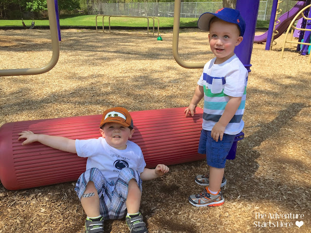 11 am... we meet up with a friend at a playground nearby. We hadn't seen Owen (and his mom Becky) in a while, so it was really nice. It was warmer than I expected... I'm so glad I remembered a hat and sunscreen for Noah!