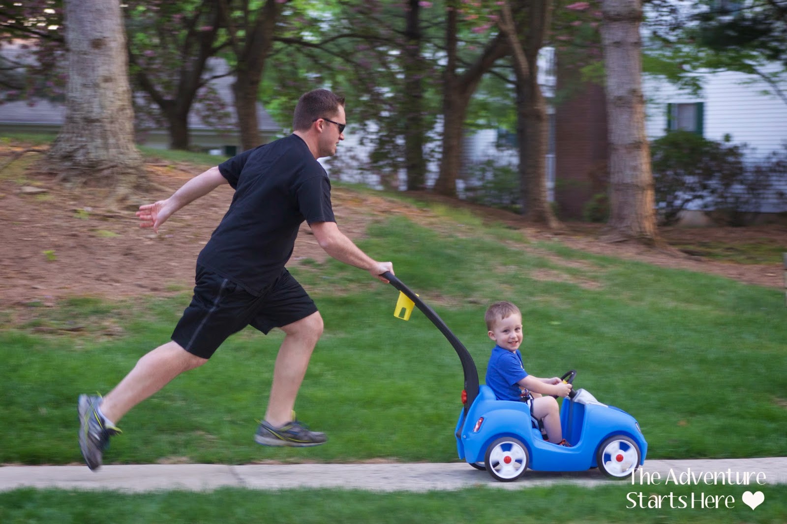 7:15... After washing the cars, Noah asks to go for a walk run in his car. I decide to let them have some father son time and take a shower in peace ;)