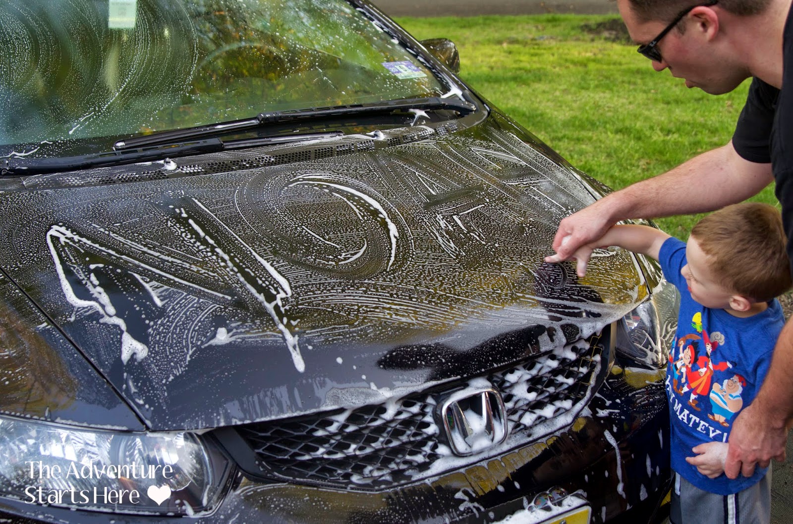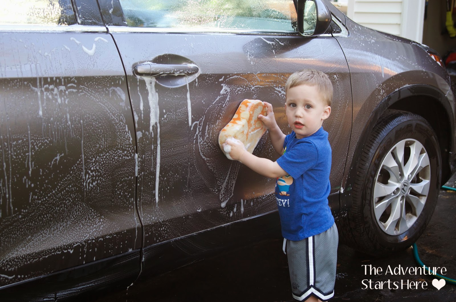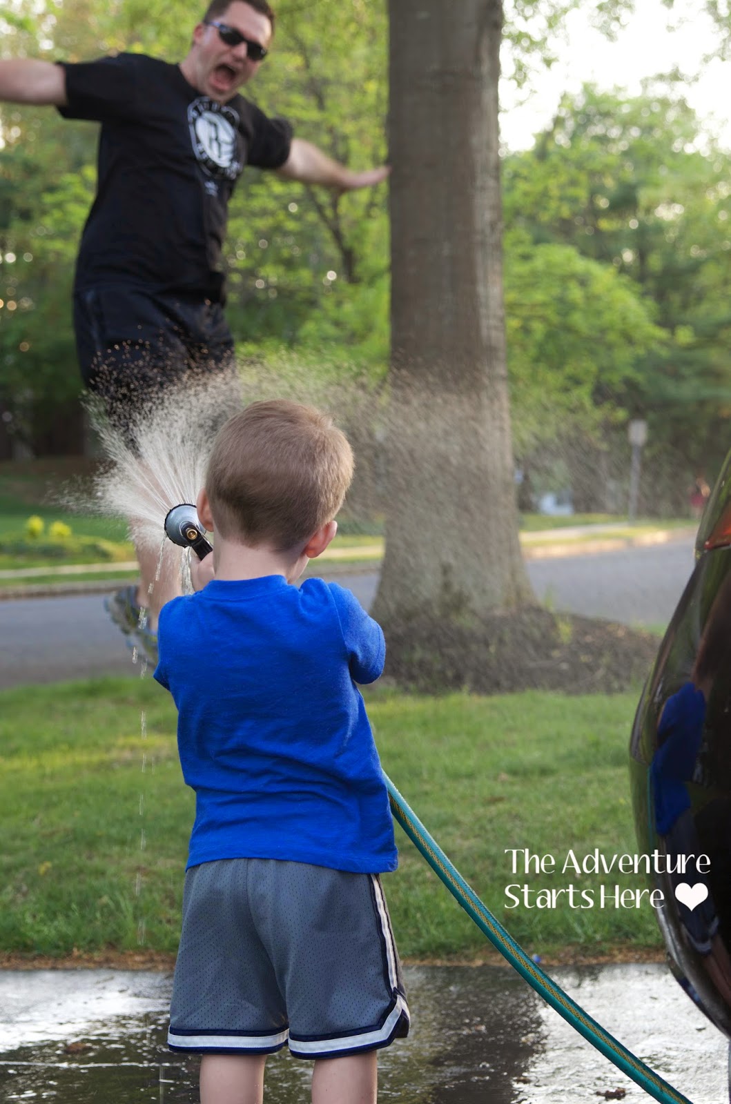 Not only did Noah wash the cars, but he also sprayed me and Chris with the hose!