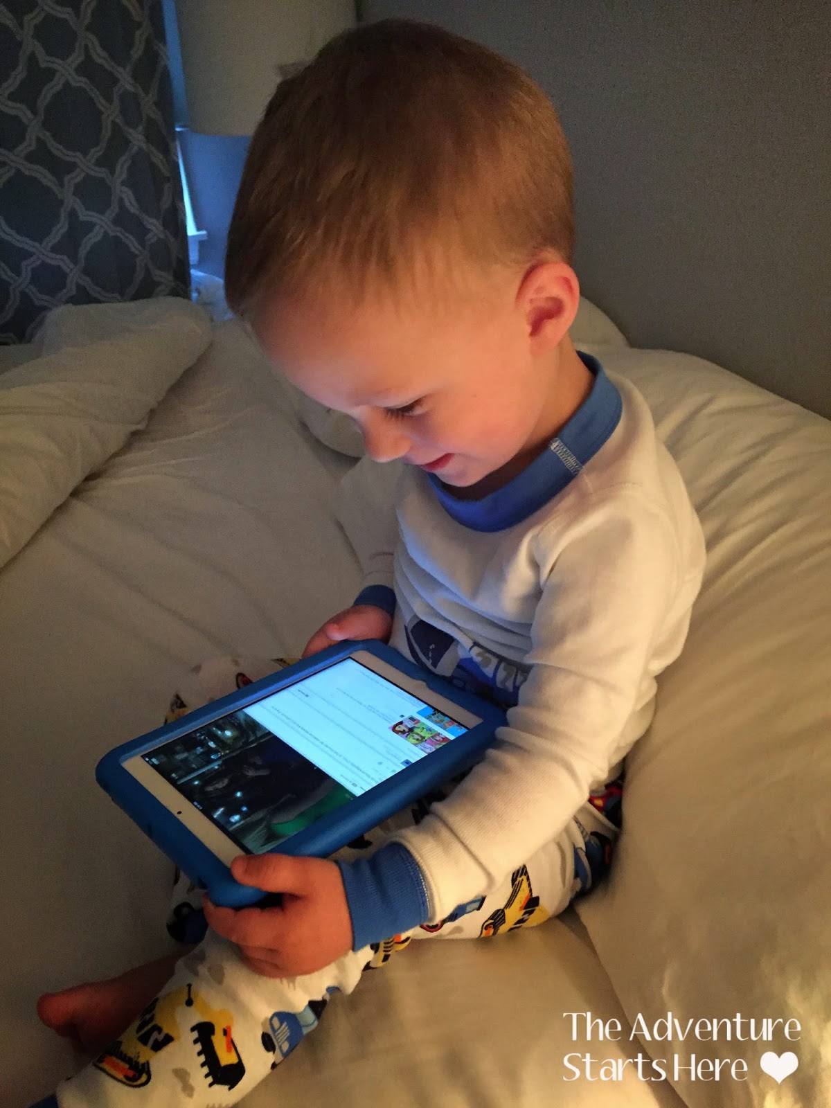 6:10 AM... Noah wakes up. Noah starts off in his crib, but when he wakes up in the middle of the night I take him into his big boy bed and finish the night in there with him. As soon as he's up, he asks for his iPad and apple juice. I take my time waking up and read a few blogs while Noah watches videos on the iPad.