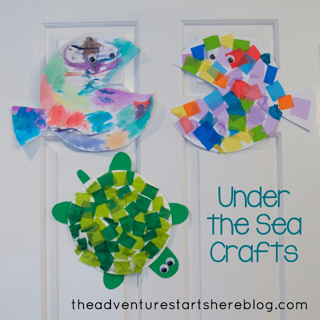 Recently, I've been finding a lot of "Under the Sea" crafts on Pinterest. I thought it would be fun to do a bunch of these this summer and learn a little about the ocean. We've gone to the aquarium before and Noah really seems to like fish and turtles. I found many options for making fish, so I decided we could do two kinds one afternoon. We painted one with some watercolor paints and we glued tissue paper squares to the second.