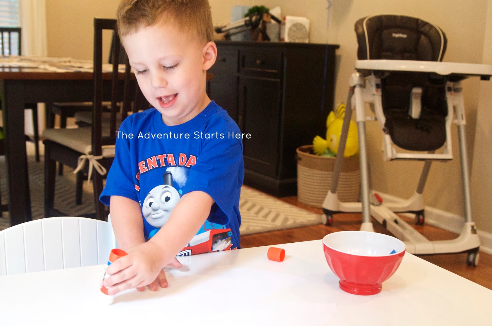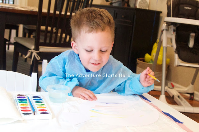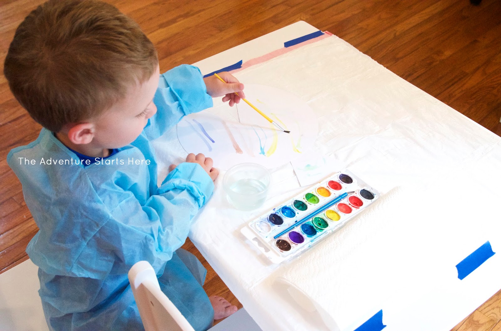 ^^^ I keep meaning to buy an inexpensive table cloth, but in the meantime I just tape down (using painters tape) a trash bag to keep his play table clean. I use these small Glad containers for the water and have a paper towel on hand.