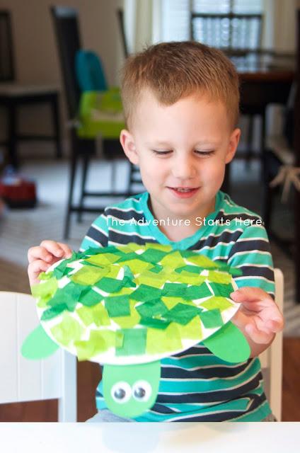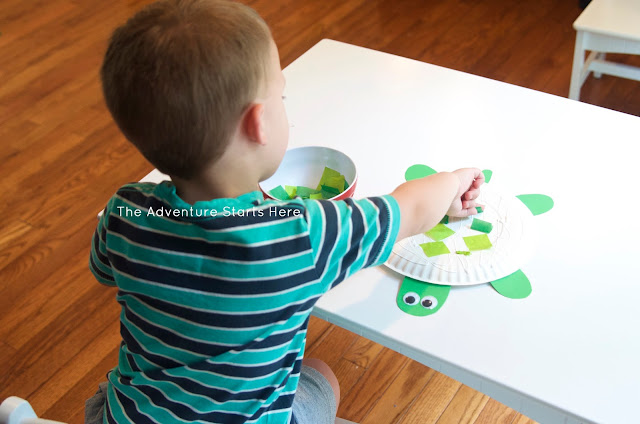 I simply free handed the head, feet, and tail, and cut them out from the card stock. I helped Noah glue all the parts onto the paper plate and ended up using some scotch tape to help keep them securely attached. The glue alone wasn't cutting it. I then squirted some regular Elmer's glue all over the plate and Noah started sticking the tissue paper squares all over the plate. He also liked to use the glue stick to add some extra stickiness ;) Glue on the googly eyes and you have a turtle!