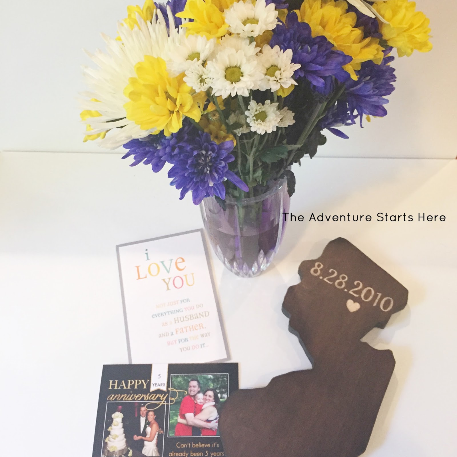 As for gifts, Chris surprised me with a few things throughout the day. Some pretty flowers (purple for me and yellow for Noah) and an anniversary balloon :) He also gave me a beautiful personalized card and a gift card for a massage. I went the traditional route and got Chris a wooden "map of NJ" with our anniversary date engraved as well as a card :)