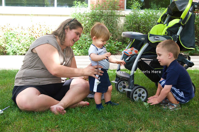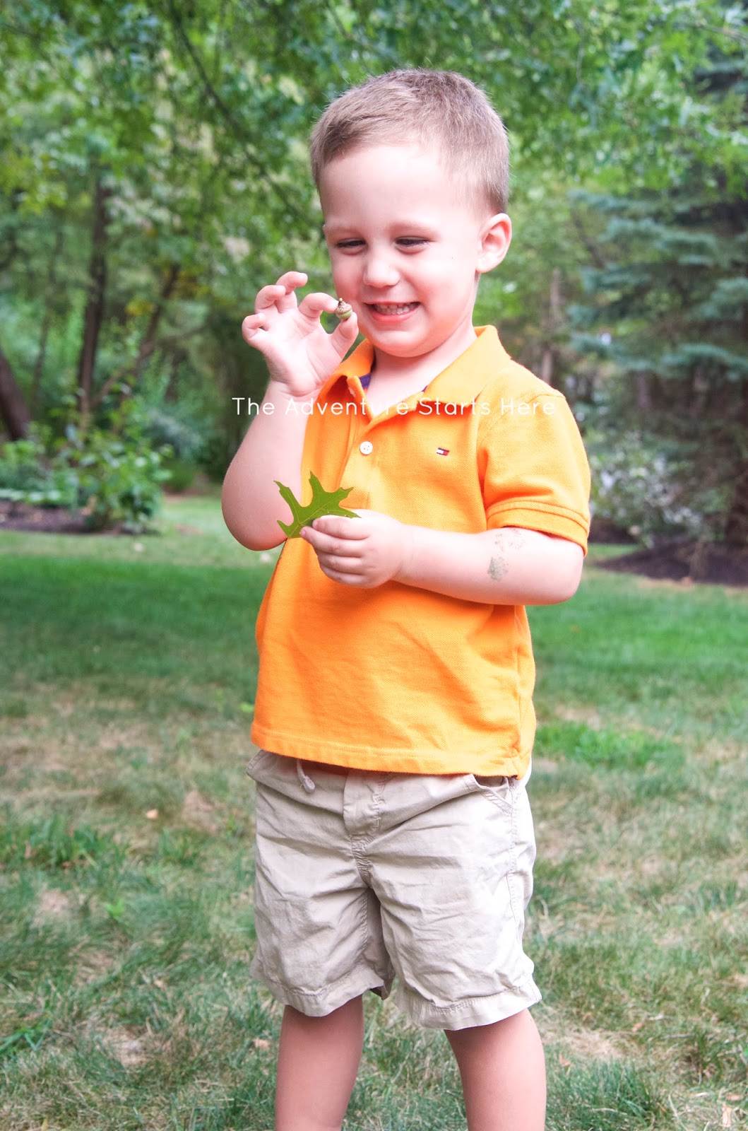 We had planned to go to the pool after nap, but Noah didn't want to go and I had a headache. Instead, we played around the house and then I took some pictures of Noah for his birthday invitation. We bribed him to take photos by promising a "jump rope" that was really just a piece of twine ;) He was also pretty excited to find a leaf and an acorn in the backyard.