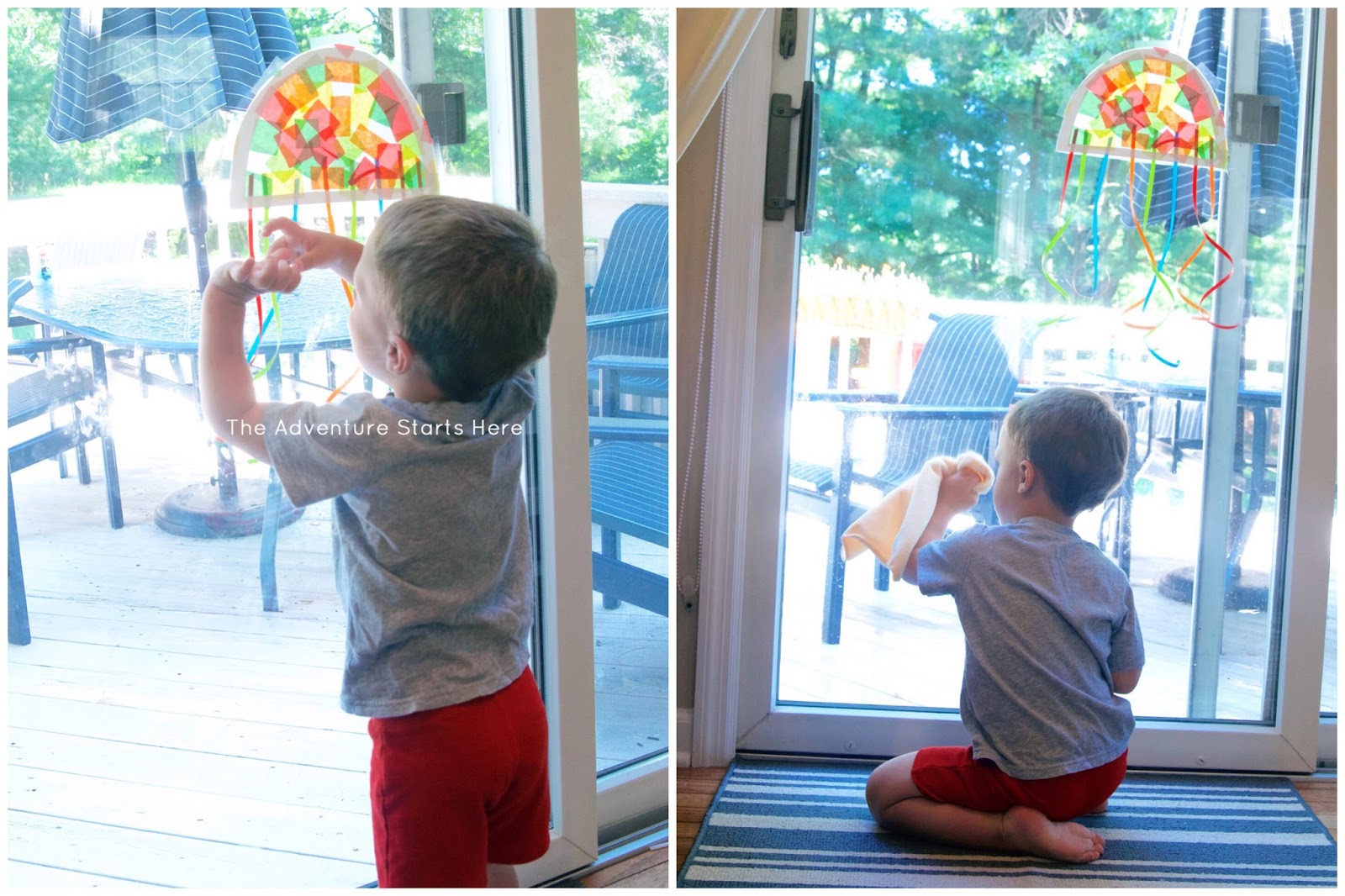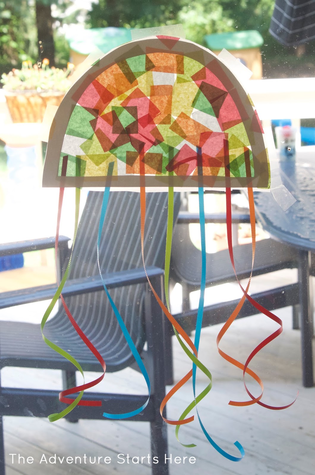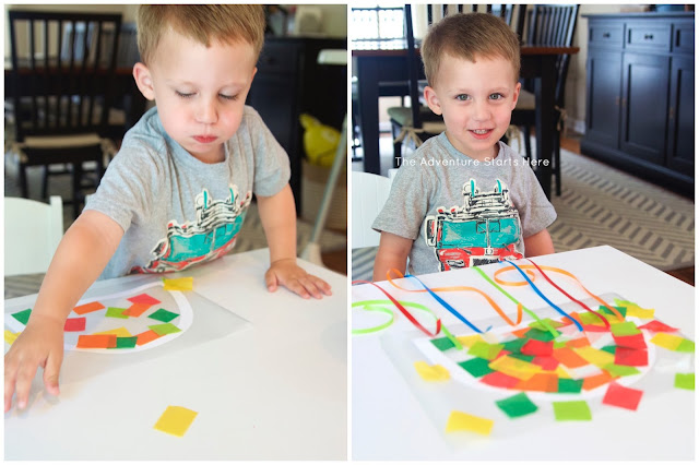 I simply free handed the jelly fish (a half circle) on some white card stock and then cut it out to act as the outline. I stuck it to a piece of contact paper and then let Noah stick the tissue paper squares all over the sticky contact paper. When he was finished, I helped him place the strips of ribbon to the bottom of the jellyfish. I then sealed the craft together with an extra piece of contact paper. Usually, I just have to cut around the craft to trim the extra contact paper, but this time I had to avoid trimming the hanging ribbon. So I lifted the contact paper up where the ribbon hung, and trimmed it that way.
