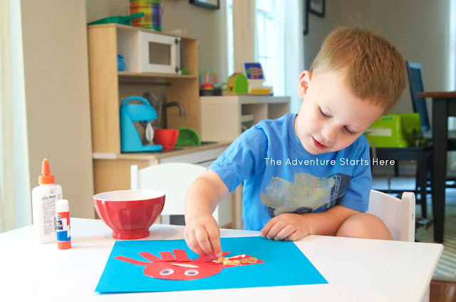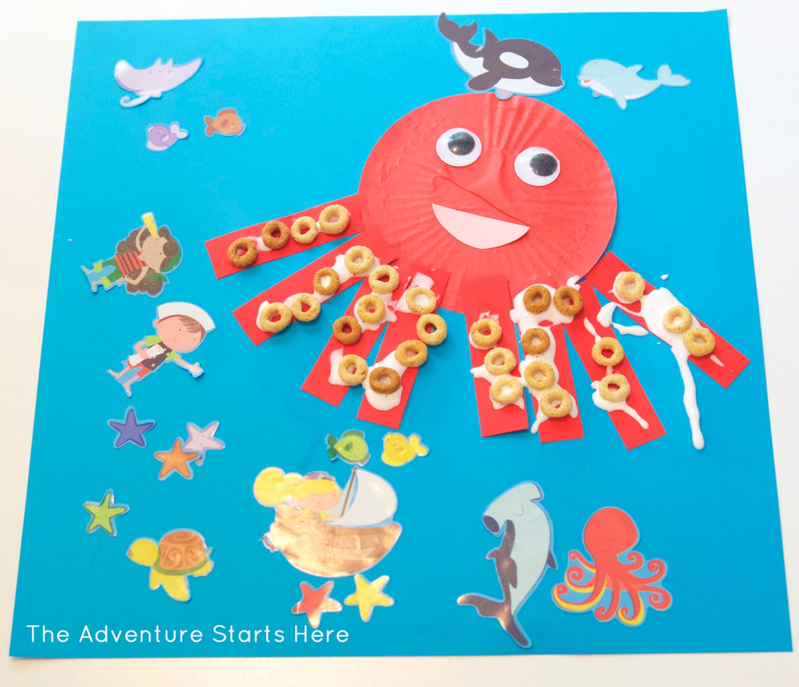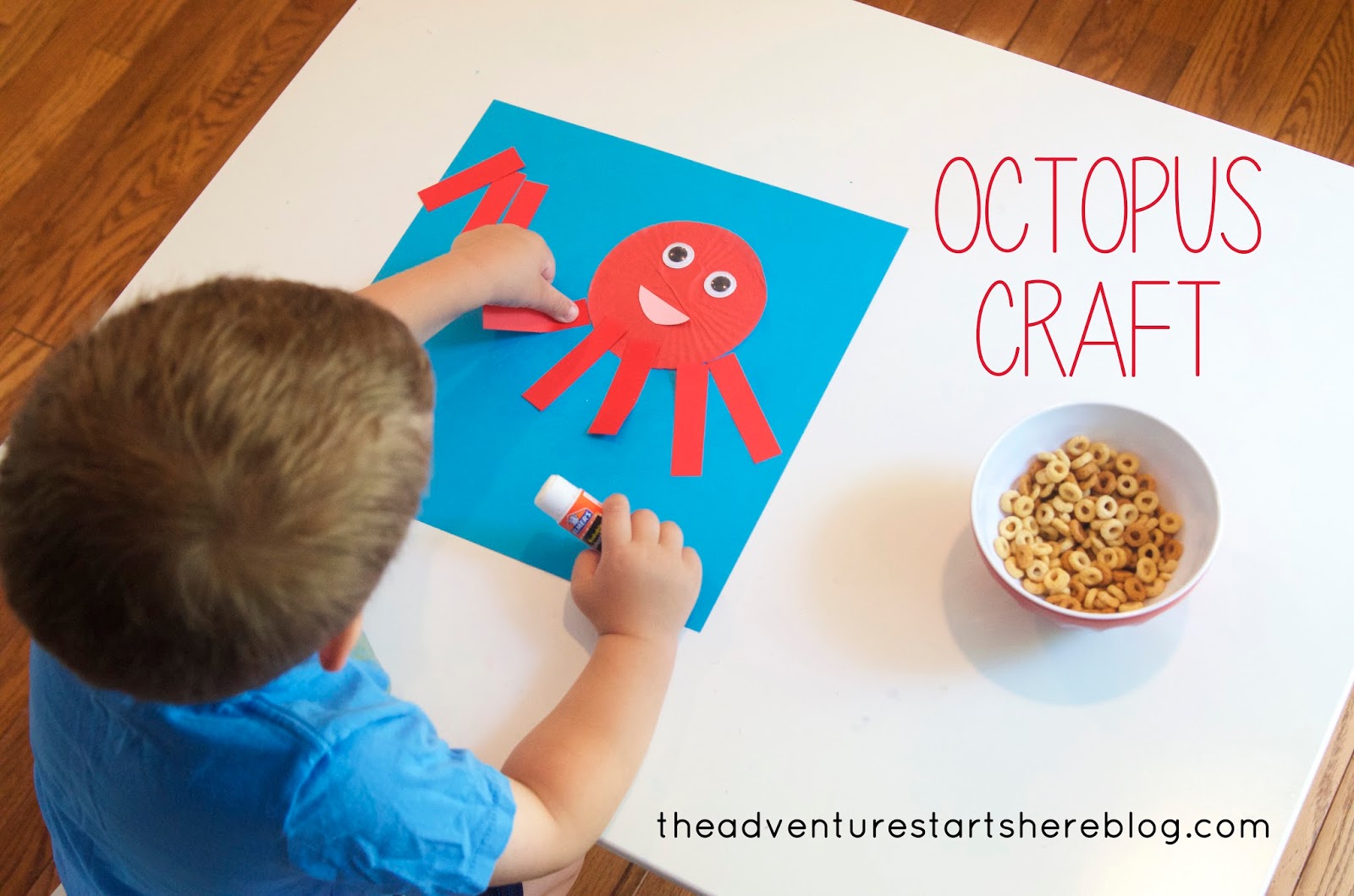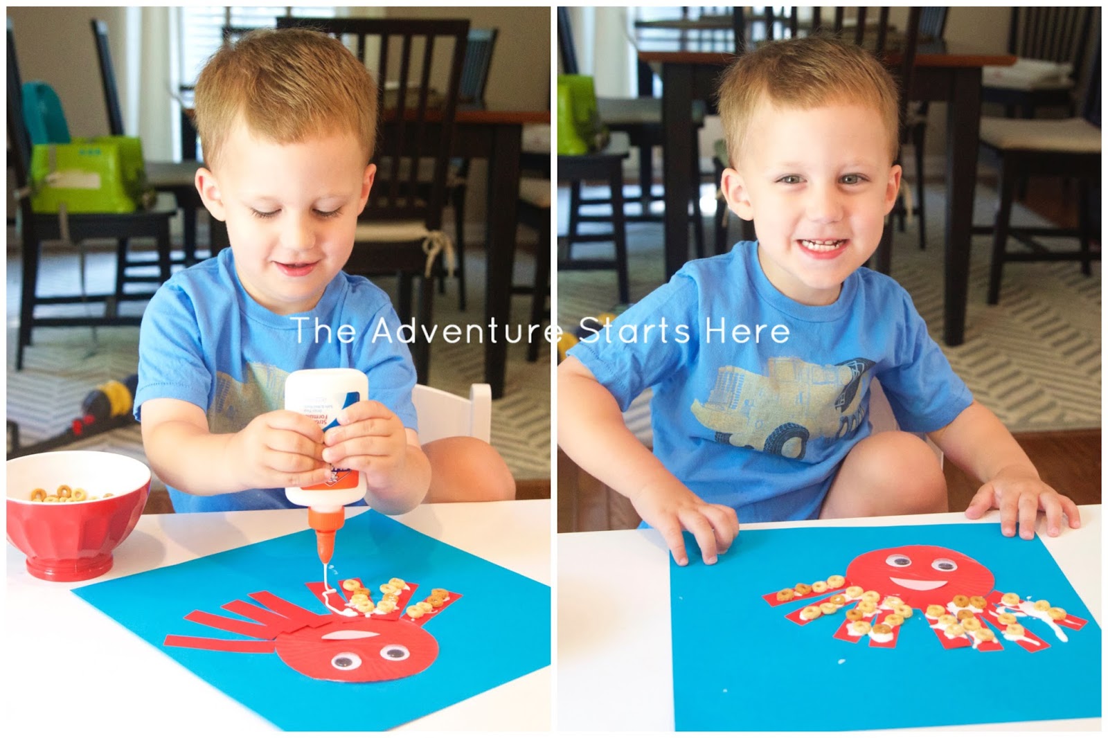 I used a 12x12 piece of blue card stock as the ocean background. I flattened the muffin liner for Noah, cut out 8 rectangles for the legs, and a pink mouth. After everything is prepared, it's as simple as gluing everything down and assembling the octopus. I explained that the octopus had 8 legs (and we counted them many times) and that his "legs" are called tentacles. We started with a glue stick, but then switched to regular Elmer's glue to attach the eyes and for the cheerios. Squirting the glue and placing the cheerios on is a great fine motor skill exercise.