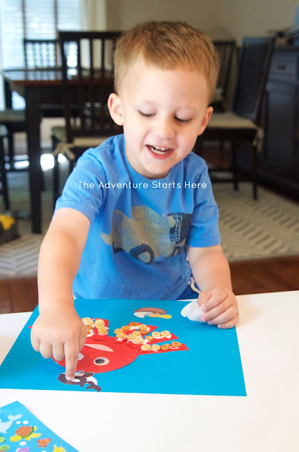 While the project could be considered finished, I remembered that I just recently bought some ocean life stickers at Michaels. Noah loves stickers, so I had him decorate the "ocean" background with them.