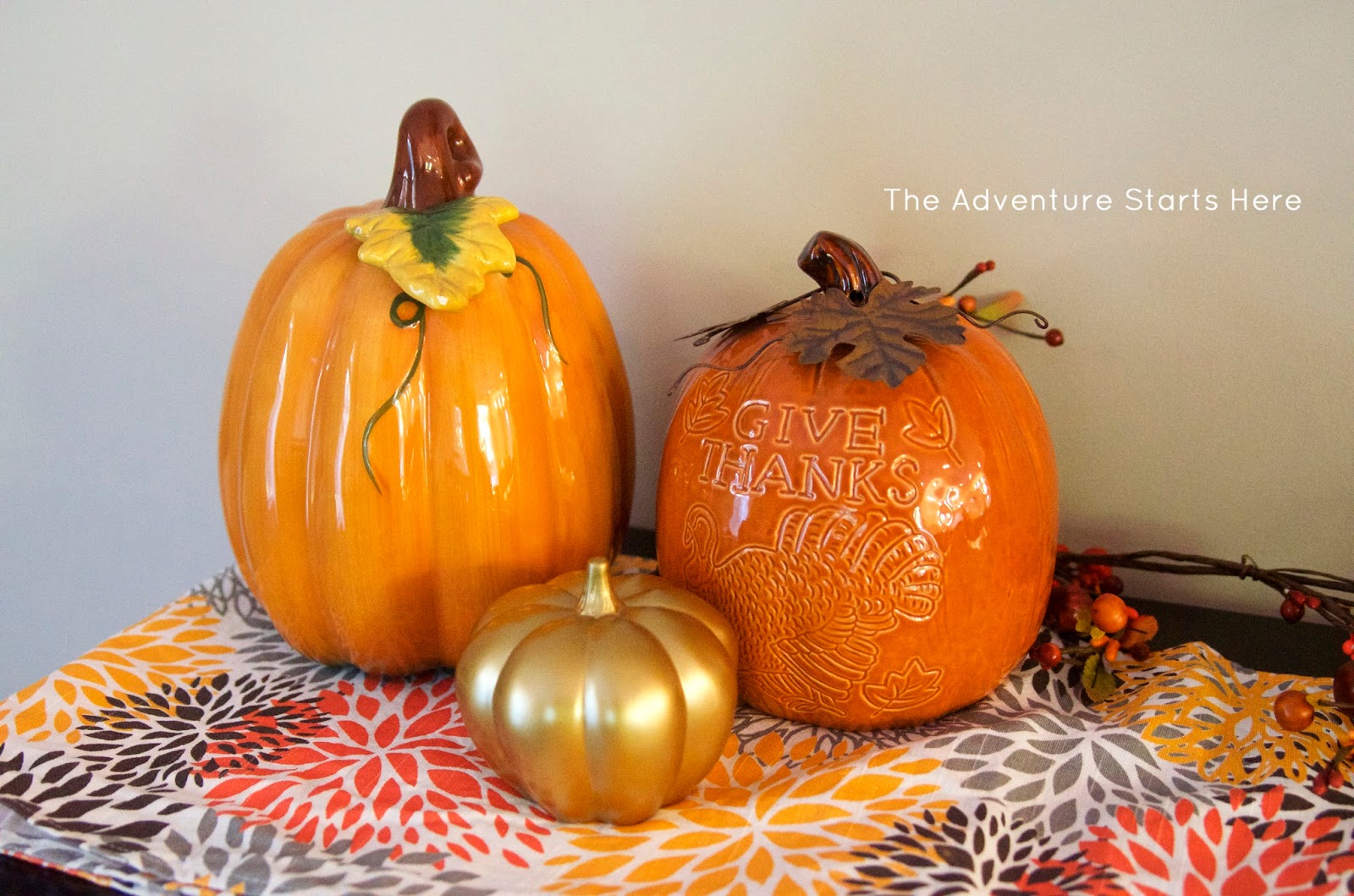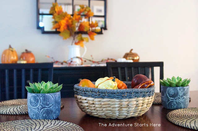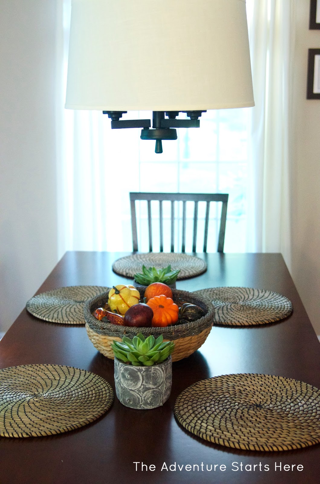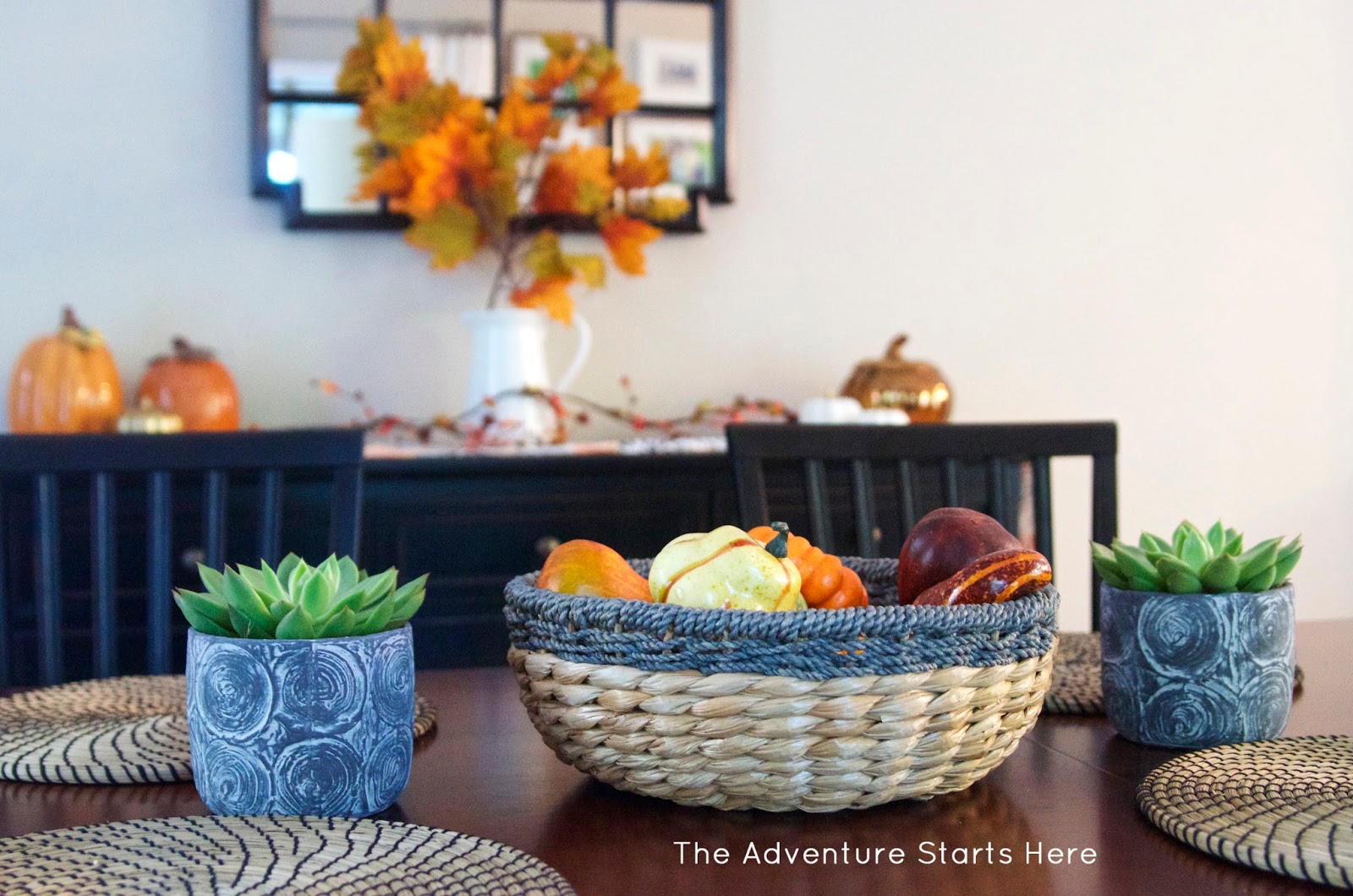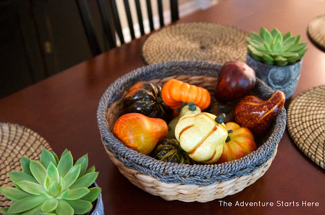 I kept the table simple with a bowl full of fake gourds, some succulents, and our normal everyday chargers/place mats.