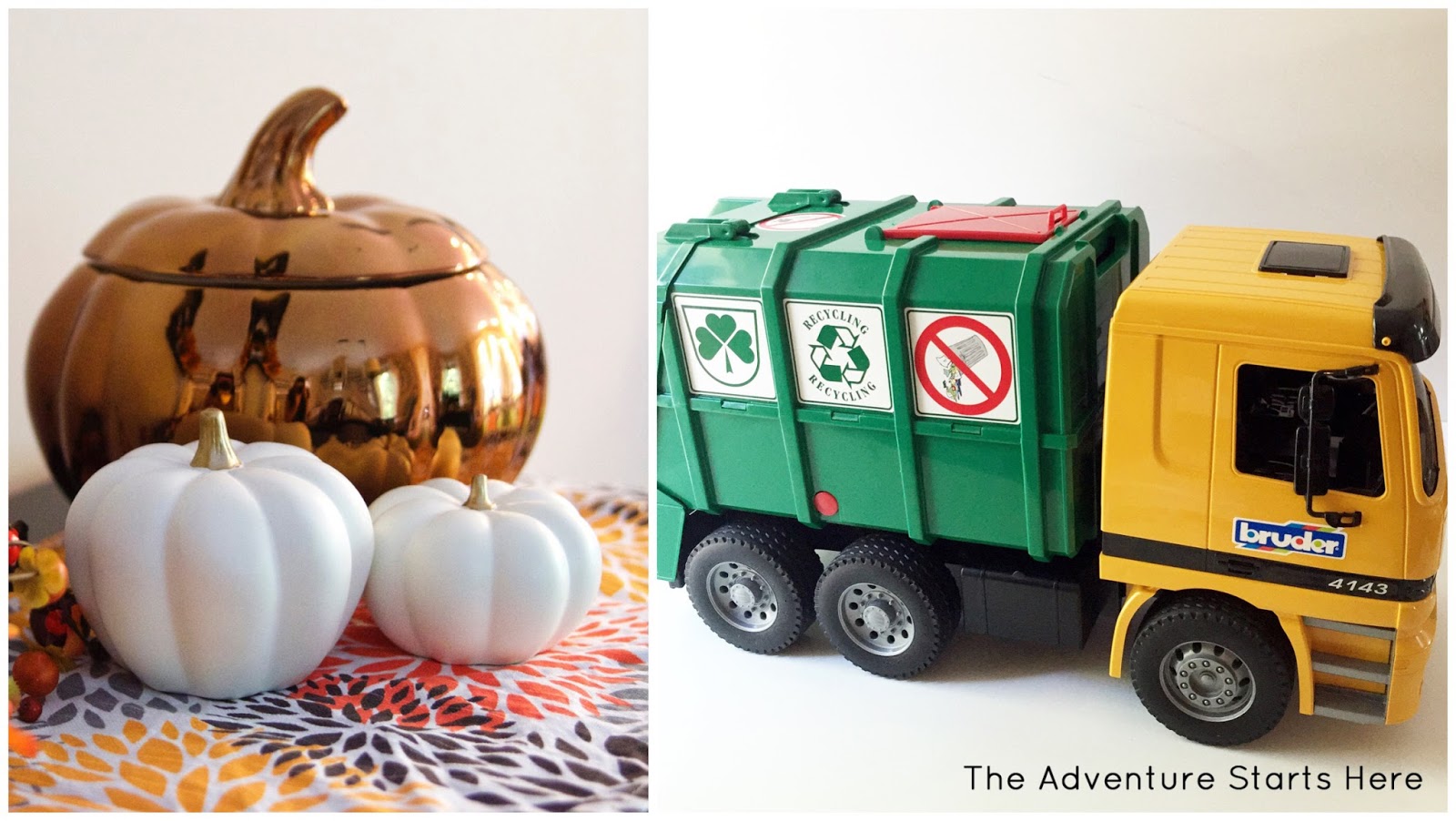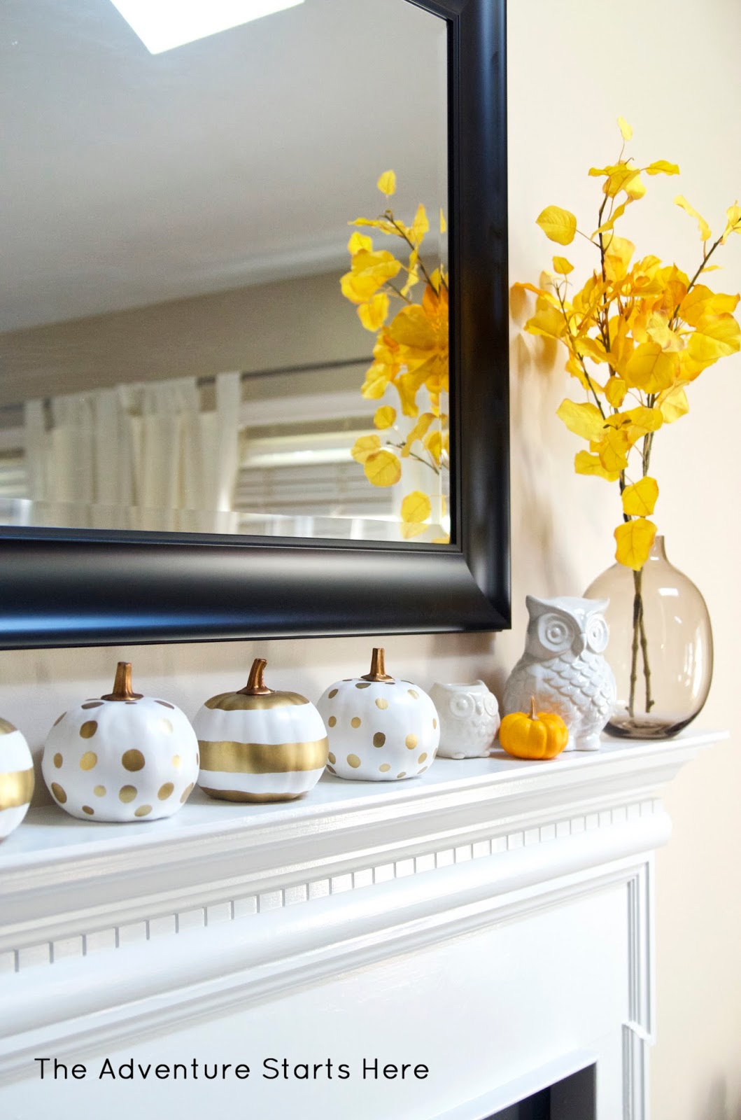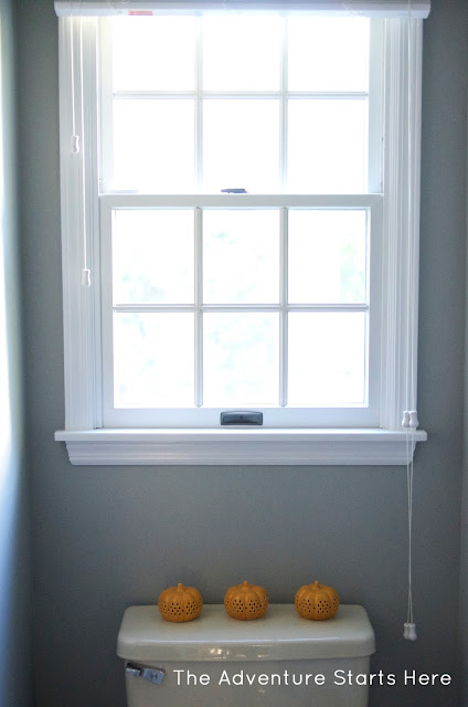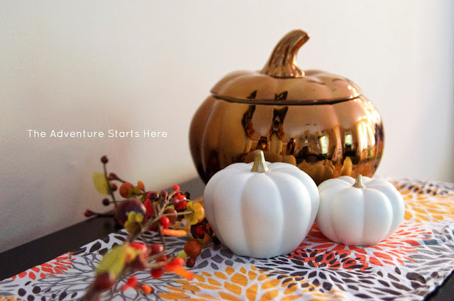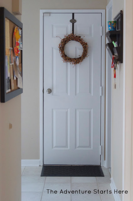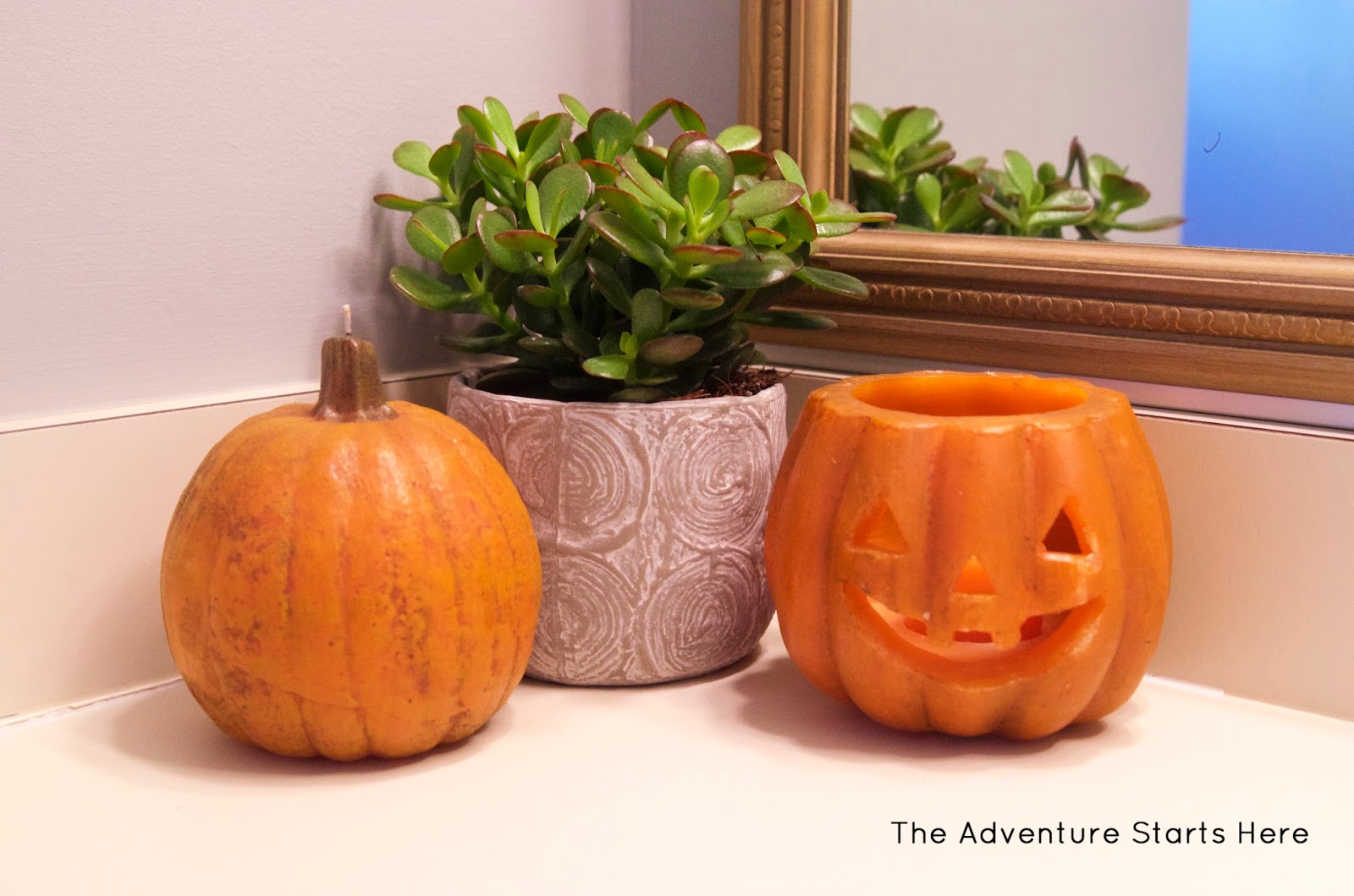 While those are the two rooms I focused on, I did sprinkle some fall decor a few other places as well. I hung a wreath on the door that leads to the garage and added a few pumpkins to our downstair powder room.