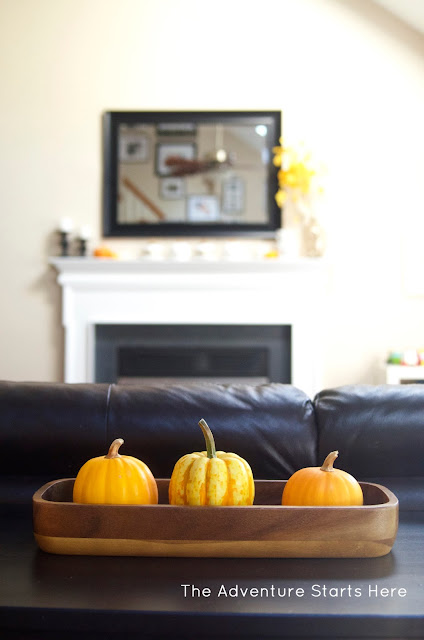 First up, the living room. Other than decorating the mantel, I just put a few (real) pumpkins in a dish on our sofa table. I would love to decorate the sofa table more, but in reality, we use it as a landing pad when we come inside the house. This wooden bowl has already been pushed aside countless times #reallife.