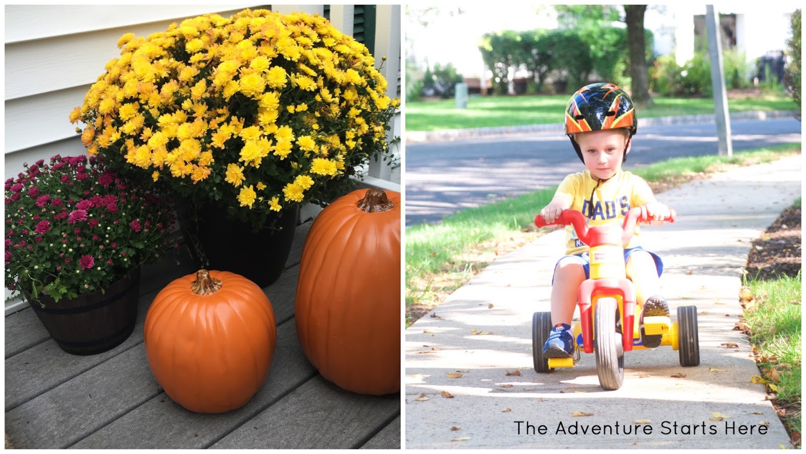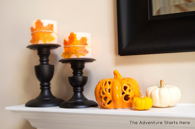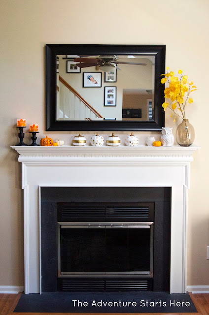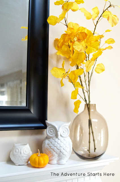Happy First Day of Fall! It's been a slow start, but we are finally starting to get some fall weather over here as well. I'm so glad, because it makes all my fall decor feel a little less silly. Something about having the air on when your house is filled with pumpkins that just doesn't seem right ;) Anyway, last week I officially started decorating (the downstairs) for fall. I switched out some of our pillows (though I'd always love to add more) and added lots of orange and yellow all over. Noah was just as excited to help decorate and kept saying we were "making it Halloween"! I'll try to keep the "talking" to a minimum and let the pictures speak for themselves. I've tried to link up as much as I could, but feel free to ask me in the comments if there's anything I missed.