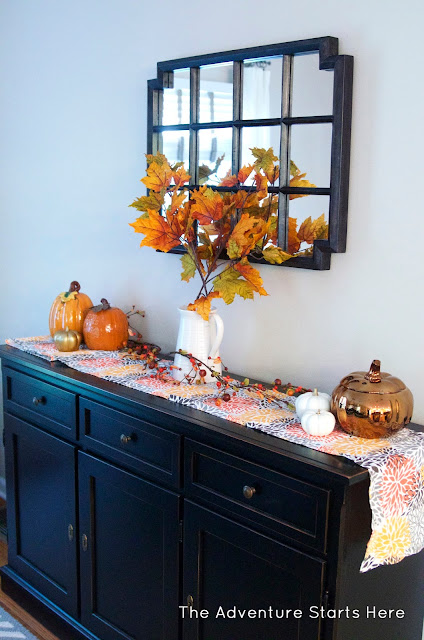 used to have some floral prints hanging above the buffet, but I found that the blue prints made it hard to decorate for the holidays. I decided to swap them out for this wooden window pane mirror I just found at West Elm. It was on final sale and I'm absolutely in love! Thanks dad for spending almost 2 hours hanging it! I decorated the buffet with a mix of pumpkins I already owned while added a few new pieces. I had to fold the runner a little bit since it's too long for the buffet. I bought it for our dining room table when it's fully extended, but until I find another I love just as much for the buffet, it does the trick :)
