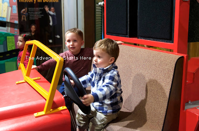 We made the 4 hour drive (there, it too much longer to drive home!) to their new house in Massachusetts.  We dropped off our stuff, had a quick lunch, and headed into Boston. We all squished into our car (Nicole was such a trooper to sit in between the car seats) and headed to the Children's Museum.  We found it to be very similar to the Children's Museum in Baltimore, which was great since Noah loved it there as well.  The boys played there for a while and had so much fun exploring.  The boys loved the bubble room and the room with golf balls and different ramps/slides.  But they loved the rooms with the trucks and train table just as much... it doesn't take much to make them happy.