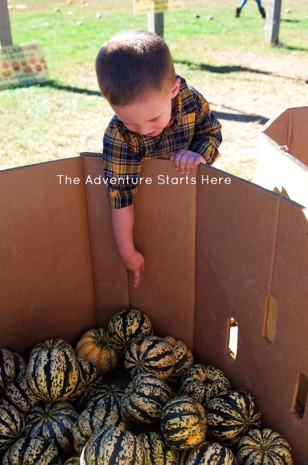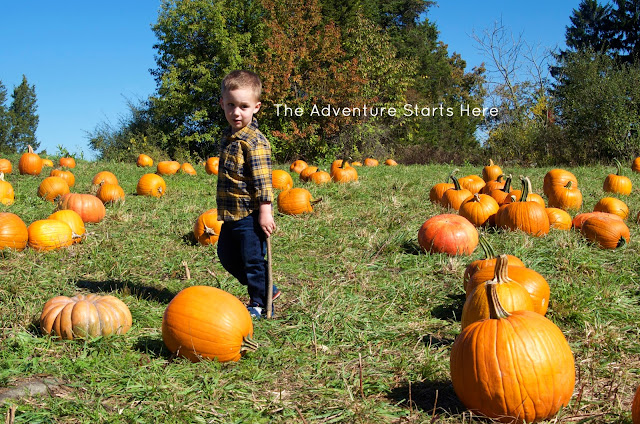 The pumpkins weren't on a vine or anything, but that doesn't really bother me... I've never actually been to one where they are on a vine ;) Noah immediately found a stick and started drumming on the pumpkins and pointing to the ones he wanted. We decided to pick one out to bring back and get the rest in the store (so we wouldn't have to carry too many back on the hayride).