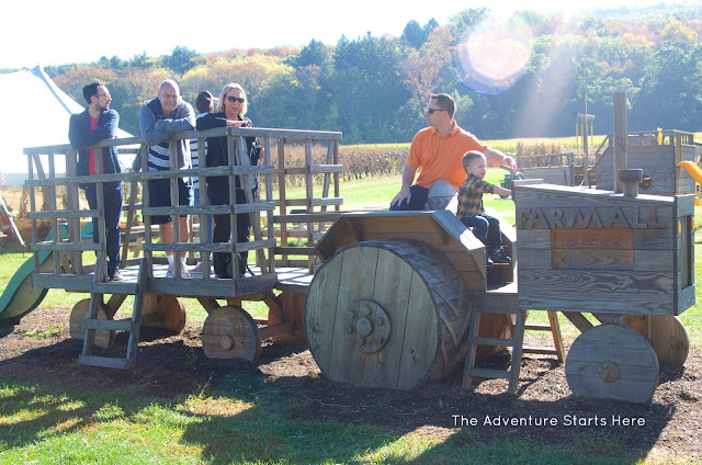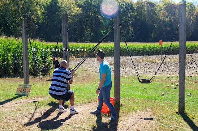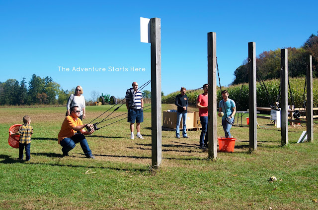 Next up, was some fun for the adults. One of the reasons we love our local farm is that they have a pumpkin slingshot. When the timing didn't work out to go there, Chris searched for another farm that had a slingshot. That's how we came across this farm. He was so excited that they had a "corn launcher" as well, but he was super disappointed that it wasn't working when we were there so we didn't get to try it out. The pumpkins slingshot was fun, but a lot harder than the one at Wightman's. Just like last year, Tyler was the best at it by far!