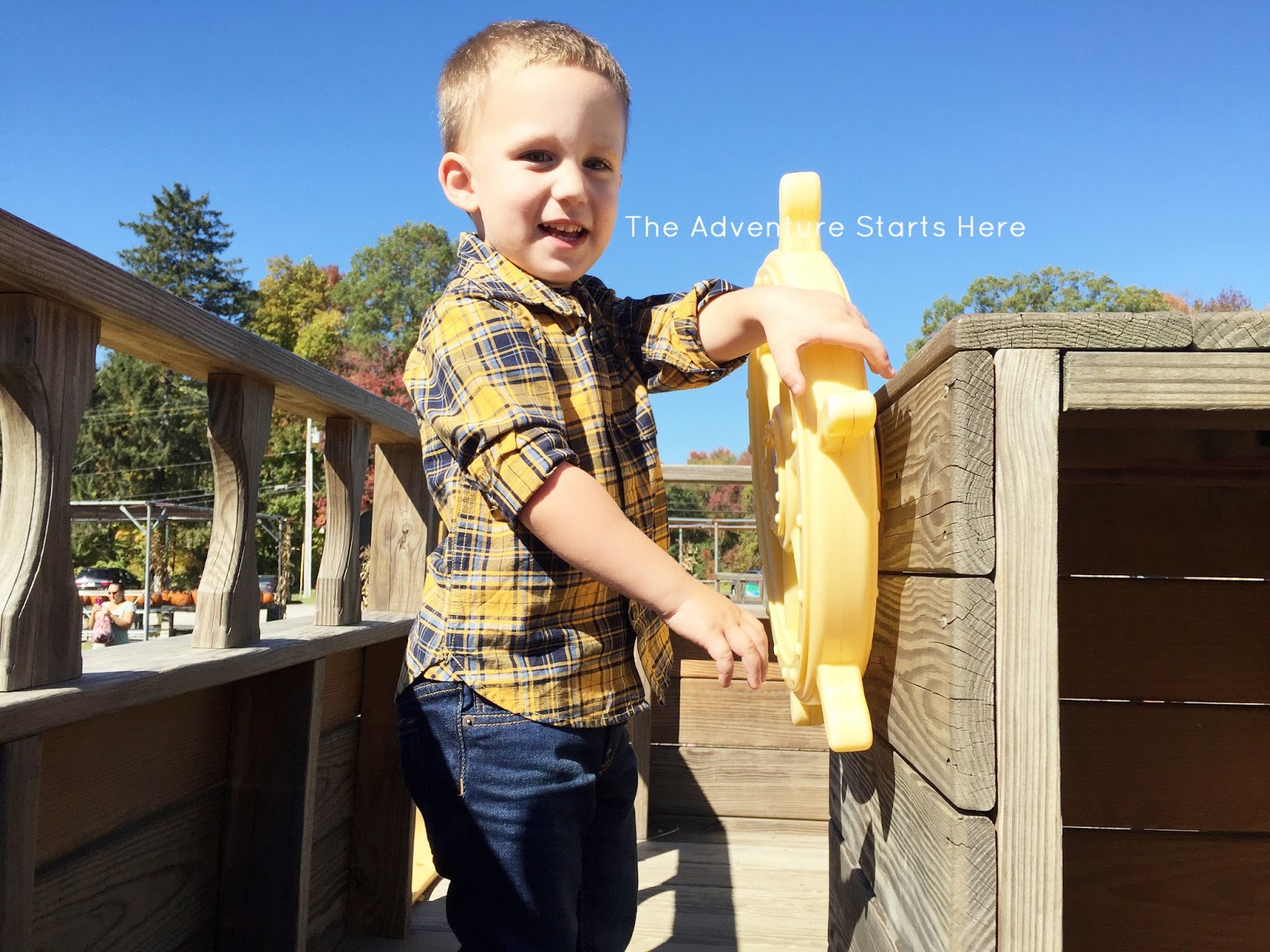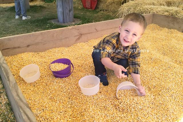 We then had some lunch and let Noah play in the little kid area. They had a "sand box" of corn kernels, a super mini hay maze, and a pirate ship playground. Noah had so much fun and did not want to leave!