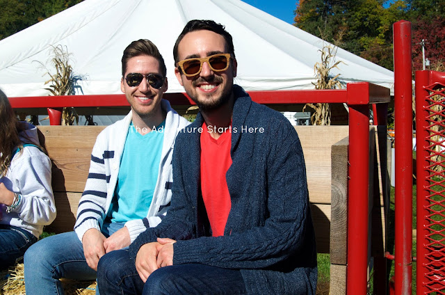 On Monday, we went to a farm to get some pumpkins and have fun doing all the other fun farm activities. Chris was off because of Columbus Day, and my brother, Luke, and his husband, Tyler, were still here because of Canadian Thanksgiving. We lucked out and got gorgeous weather... mid 70s and not a cloud in the sky! We had originally planned to go back to our local farm (Wightman's Farm), but we learned that they weren't opening until noon on Monday. Since Luke and Tyler had a 6+ hour drive home, we knew that wouldn't work. So instead, we found a farm 45 minutes north of us (and that much closer to home for them) that had lots of fun activities for both Noah and the adults.