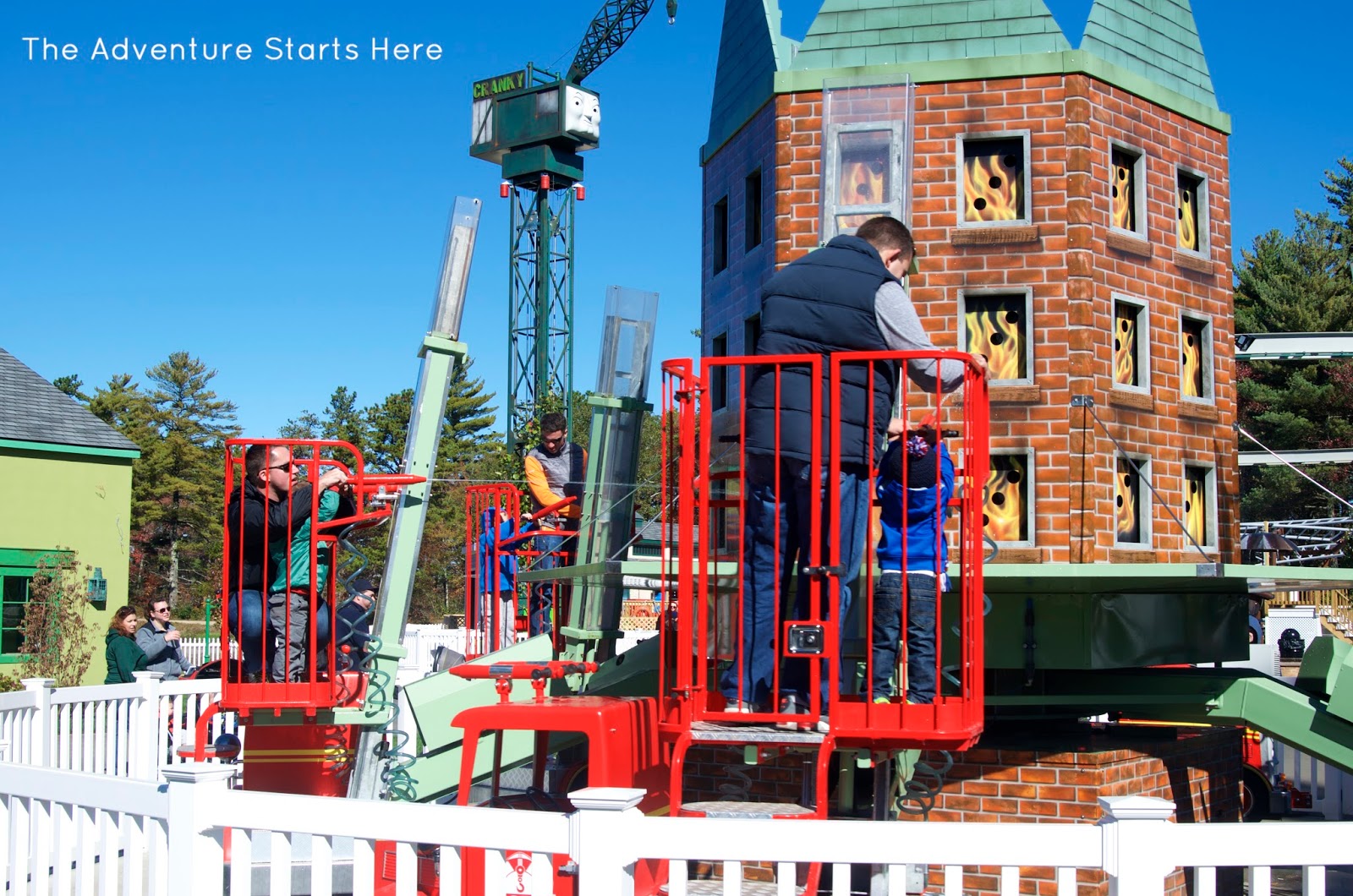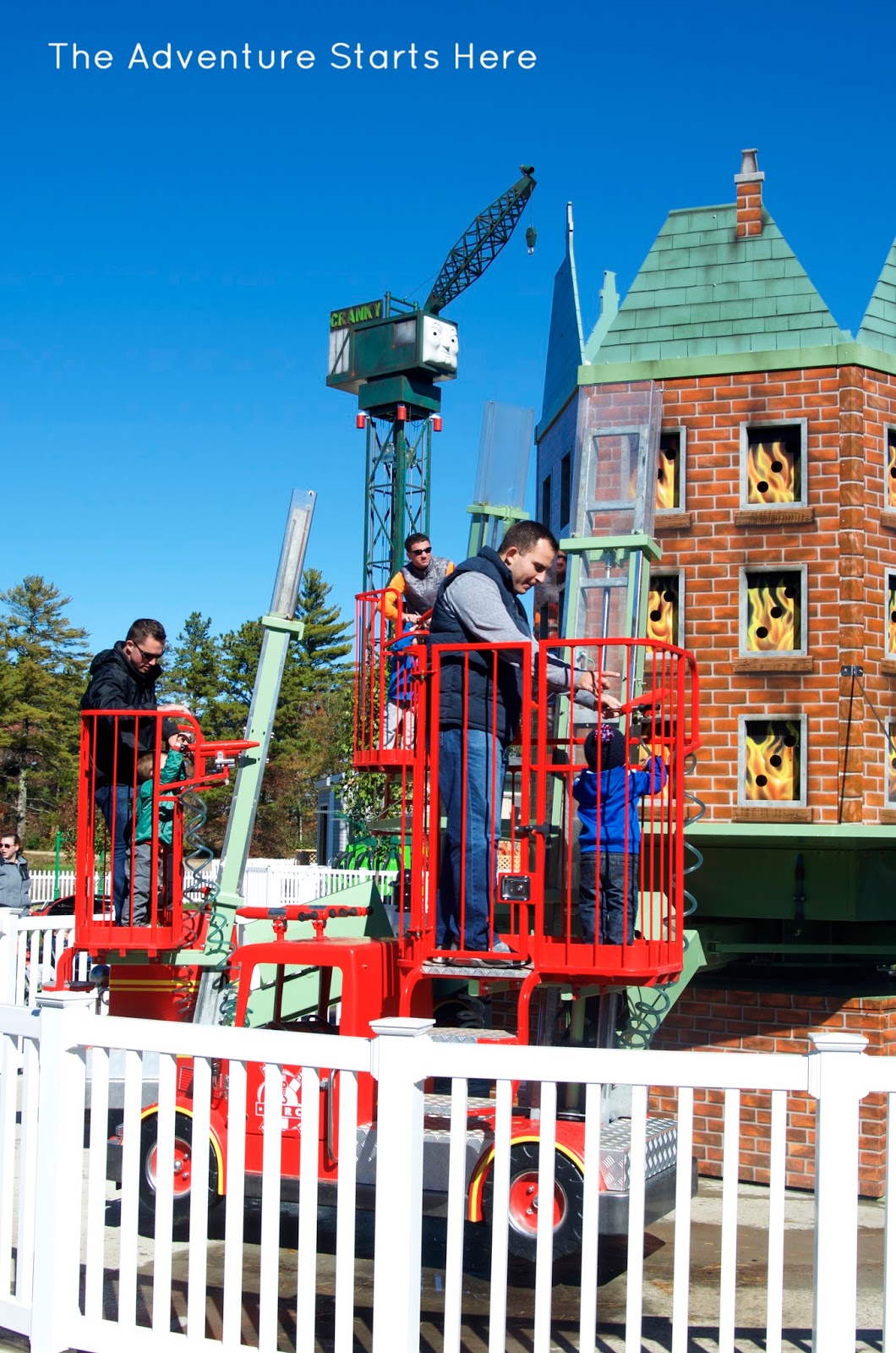 After our train ride, we walked to the back of the park where the new Thomas Land section is.  This part of the park was super nice (and new) and filled with Thomas inspired rides.  While it's not huge, it was the perfect size for our kids!  We went on all but two of the rides (the boys weren't tall enough to ride the roller coaster and free fall).  The dads took the boys on most of the rides, but Nicole & I did make sure to go on a few.  Noah said his favorite ride was Harold the Helicopter and Chris' favorite was the Fire Fighting Flynn.  It was different from any other ride we had ever seen... the kids (and adults) got to use hoses to "spray" out the fire.
