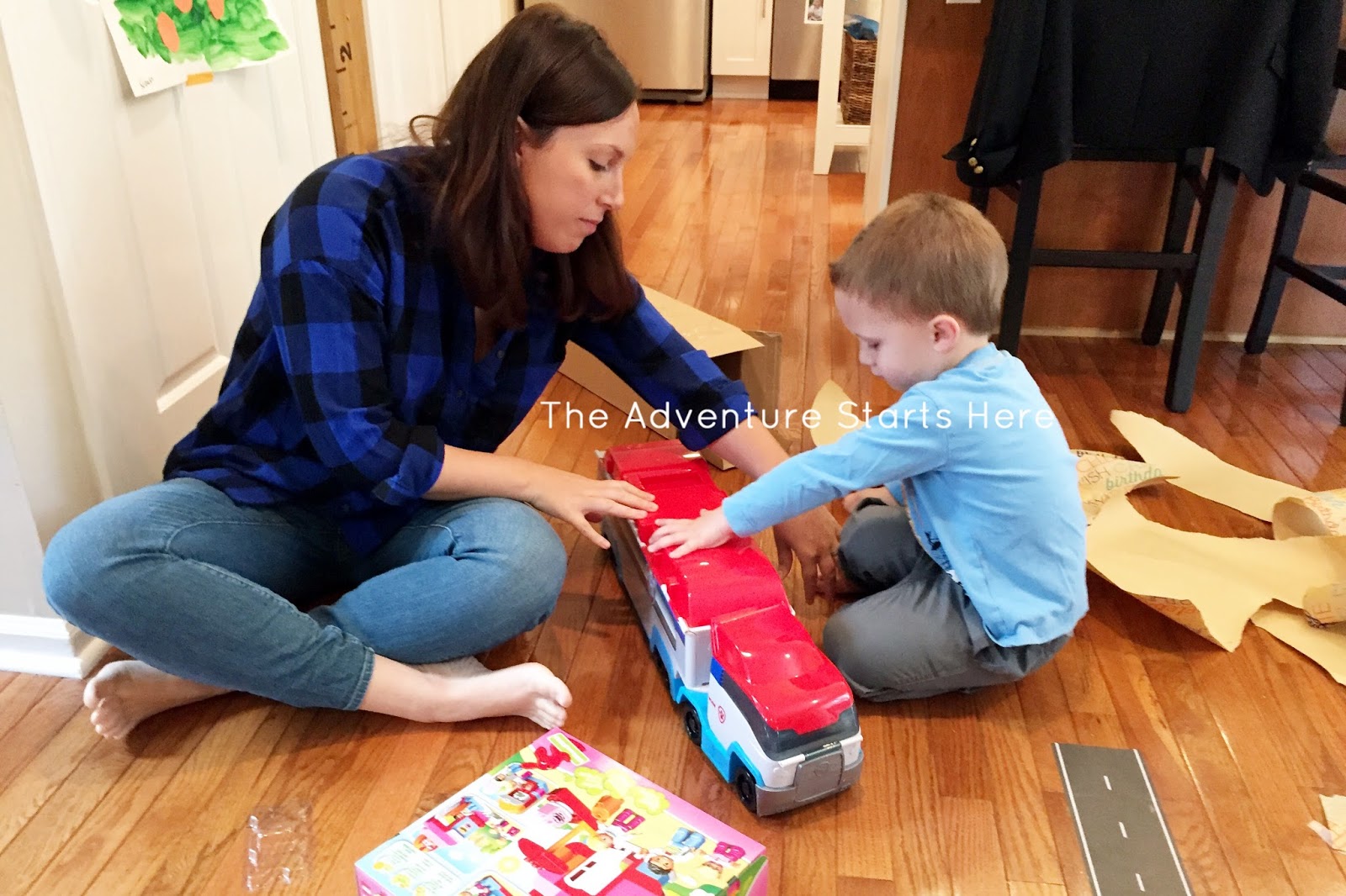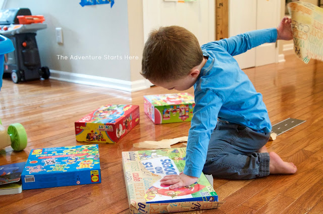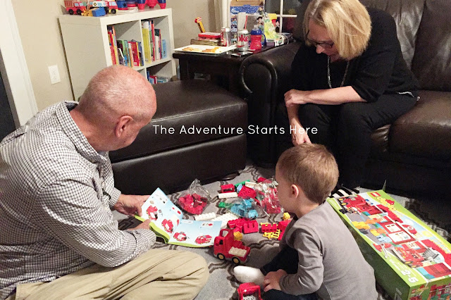 Then it was time for presents!  This is us not going overboard.  It looks like more than it is, but really I just picked up a few things... Legos, Chutes & Ladders, a book, and some Paw Patrol stuffed animals.  Then Chris found the Paw Patrol bus on sale and had to get it for him.  Noah was super excited when he saw all the gifts and loved opening and playing with everything!