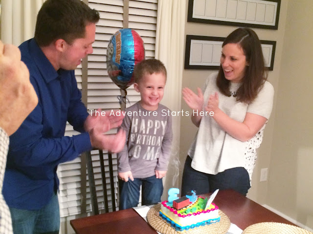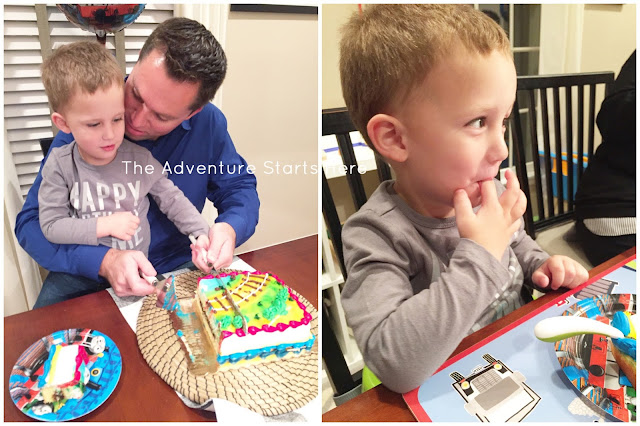 We kept dinner super simple, Chris and his dad picked up Chinese food :)  I am a huge proponent of keeping entertaining easy and focusing on the real reason for getting together.  After our delicious take out, we had more candles and singing complete with a Thomas the Train cake.