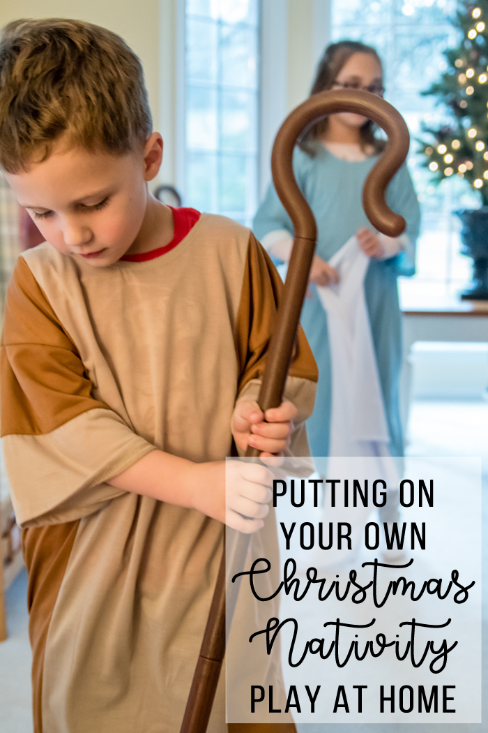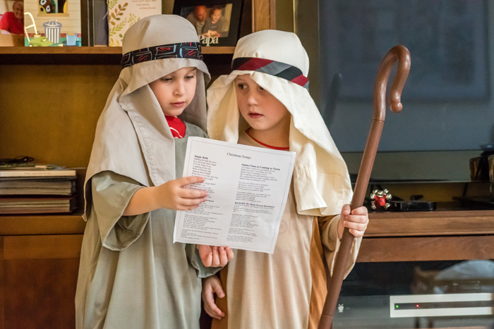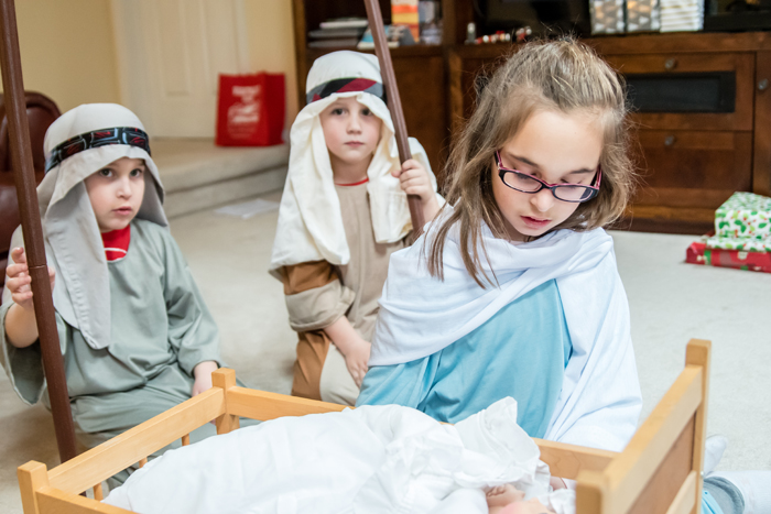 Back in 1984, this script was published in a church magazine. Over the years, my parents have adapted the original script and we now use this script for our Nativity Play. My mom's experience is that kids often mumble the lines or don't speak loudly enough. So instead, she wrote the play so that a Narrator is the only person who speaks while the children act it out. And my favorite part is that in between all the speaking parts, we sing Christmas songs to help tell the story. My dad plays the guitar and leads the singing. Here are the lyrics to the songs we sing. If you don't have someone musical in your family, you could easily sing without background music or even download the songs to sing along with.