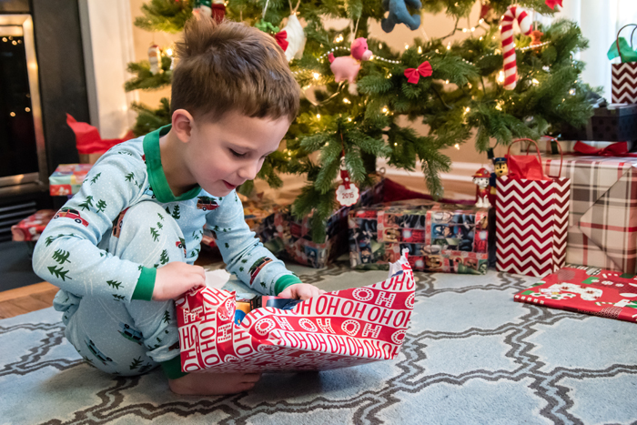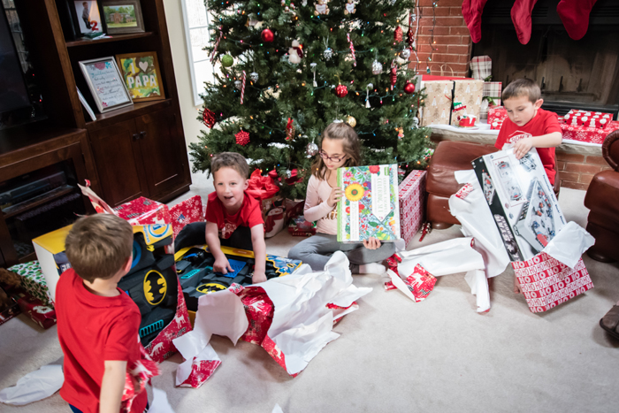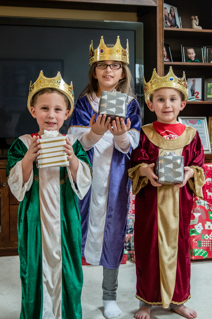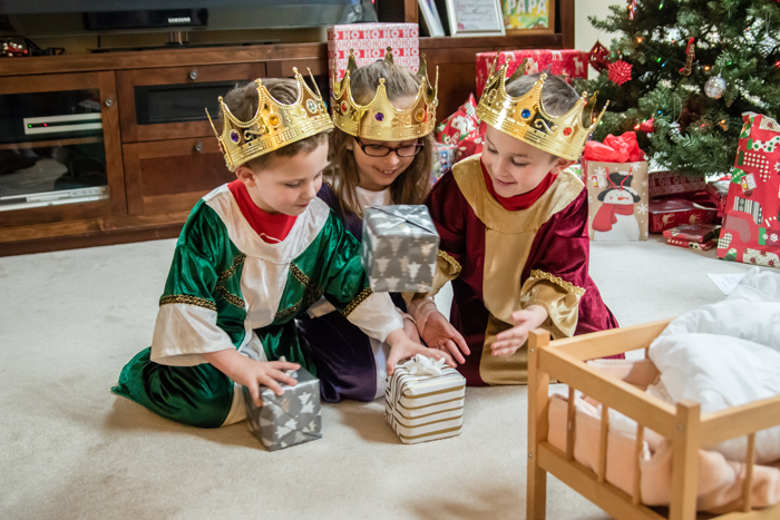 And since we only had three kids this year, everyone got to have multiple roles. Mary and the shepherds did a quick change mid play and were then the 3 Kings (we got the crowns from here). I wrapped up some empty boxes for the wise men to give to Baby Jesus. The funniest part was when the kids were goofing around moving the boxes all over the place... they each wanted the gold wrapped one ;)