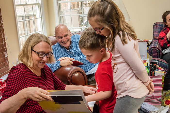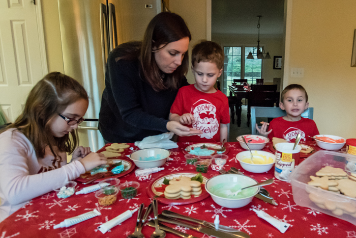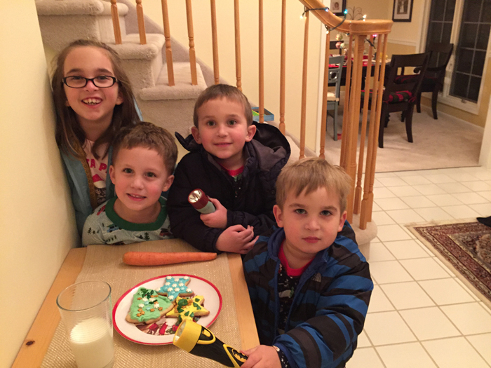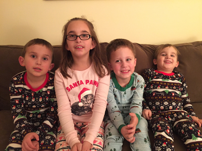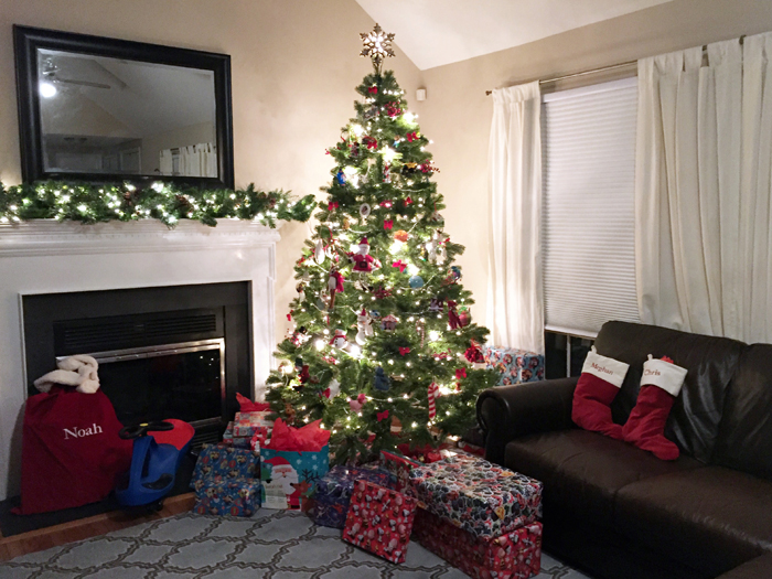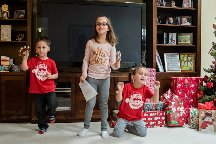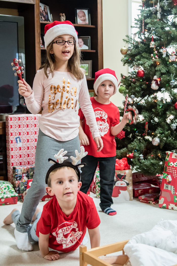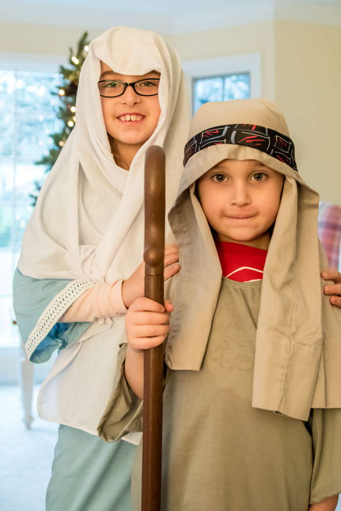 Noah's cousins drove down to New Jersey on Christmas Eve morning. As soon as they got to my parents' house, we started getting ready for our Nativity Play. Growing up, our costumes were very homemade. I remember I always wanted to be an angel and would end up wearing one of my dad's undershirts with some silver garland on my head. And the shepherds would wear bathrobes and have towels secured to their heads with a neck tie. We would even get some Burger King paper crowns and cover them with tinfoil for the 3 kings/wise men. A few years ago my mom organized and directed the play at their church, and she ended up buying a ton of costumes that we now have at our disposal. (My mom bought these costumes from