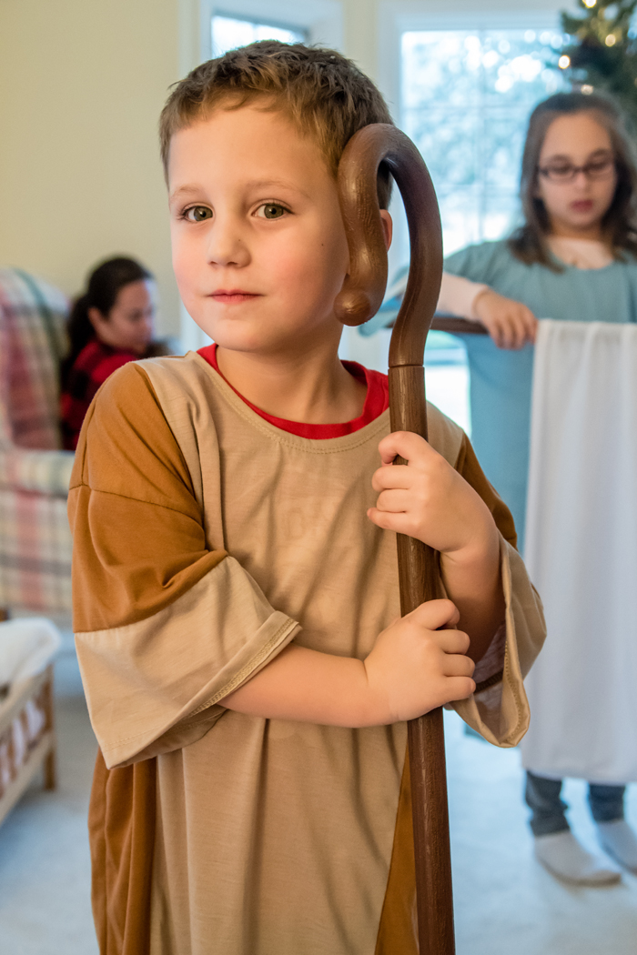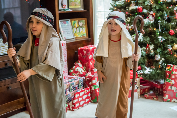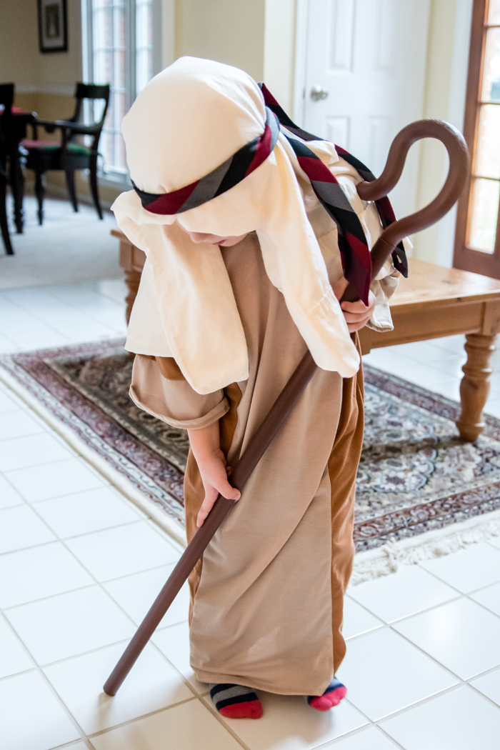 here, but my sister-in-law got some for their church from Oriental Trading). Noah has one girl cousin, and she's happy to be Mary every year. While one of Noah's boy cousins had no interest in participating this year (he wasn't feeling very well), Noah and his other cousin, Matthew, were very into it. While my mom had purchased some shepherd "dresses", we then took a king size pillowcase and neck tie to make the headdress. We learned the king size pillowcase was a much better size compared to the towels we used to use. She picked up some staffs at Party City, and while we were a little concerned the boys would use them as weapons, we were pleasantly surprised that they behaved and no one got hurt.