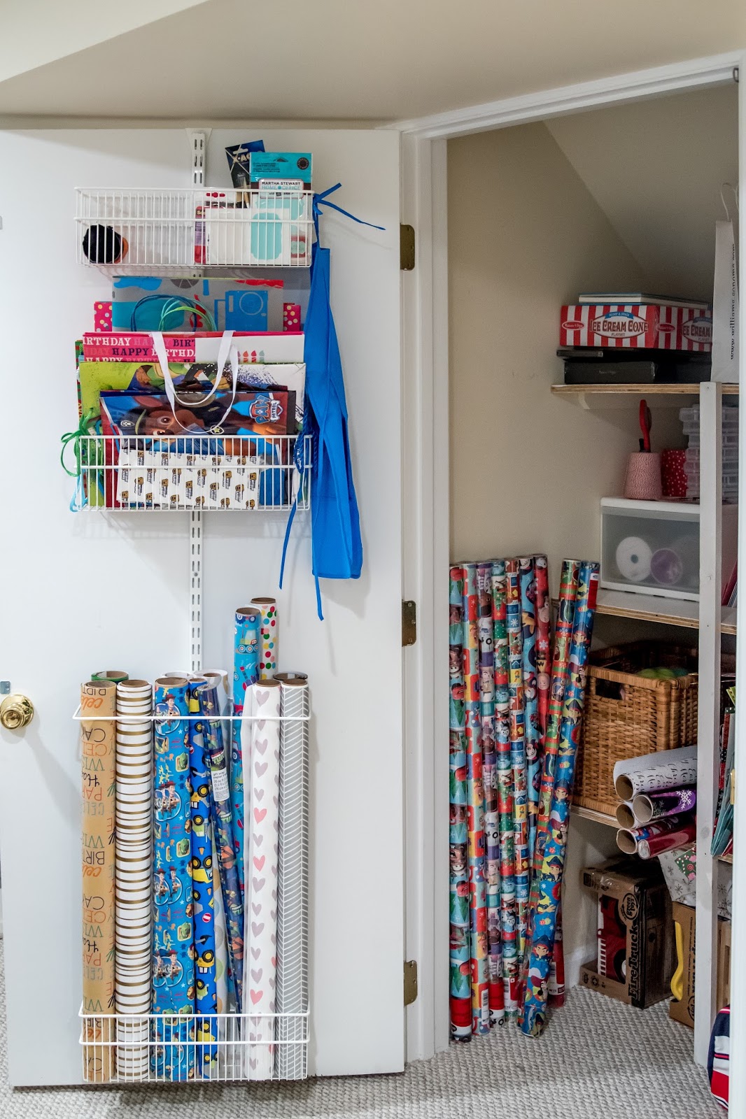 We are fortunate to have quite a few closets in our house. This has allowed me to have plenty of storage for a pantry, linens, seasonal decor, and even gifts. I turned one of our basement closets into a place to store all of my gift wrap as well as random gifts I buy throughout the year. While I use the shelves to house all my random gifts, I use the door to hold all my wrapping paper. No point wasting the door space!