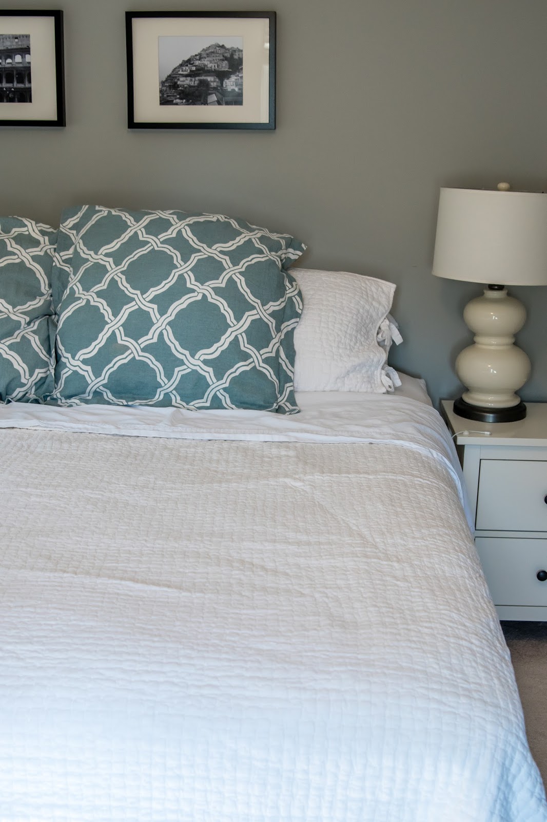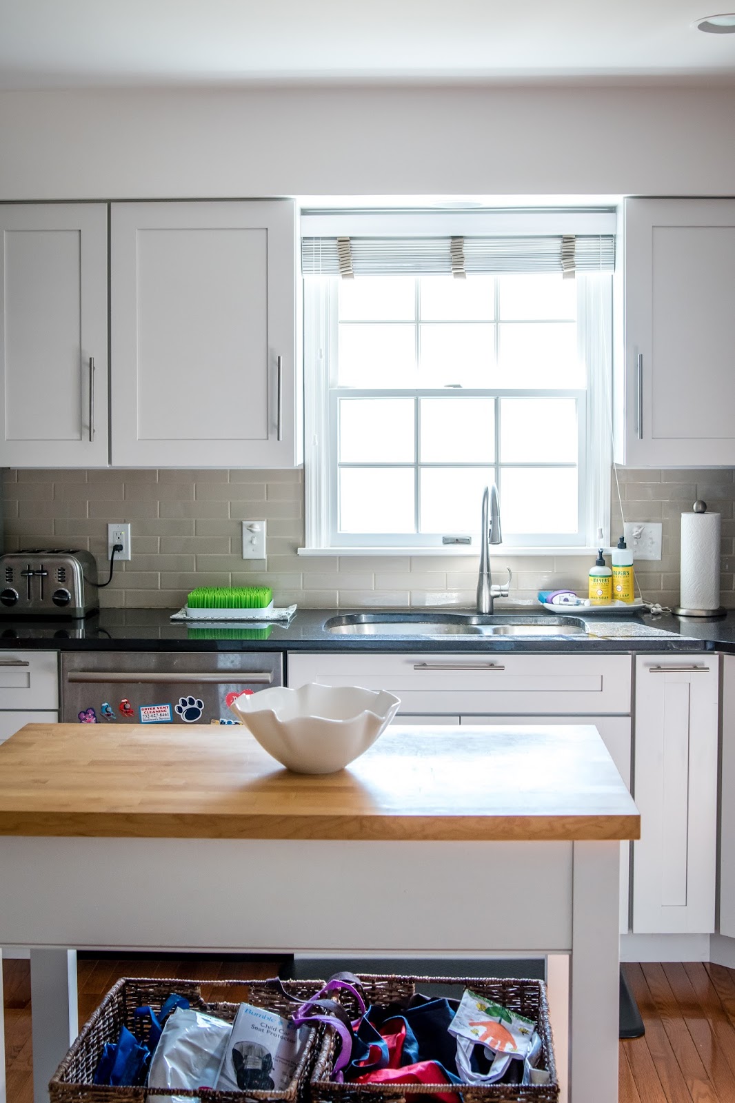 This is the one I struggle with the most, but also the one I think makes the biggest impact! My rule of thumb is to only keep things out that you use on a daily basis. For our family, that's the toaster, Vitamix, drying racks (for Noah's cups and pots and pans), our knives, cooking utensils (in a pretty jar), dish soap and hand soap, and a fruit bowl. Sometimes I wish I could clear the counters off even more, but this is real life, so I go with it.