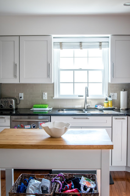 ^^^ I'm about being realistic, not Pinterest perfect. We have magnets on the fridge/dishwasher, a few things on the counter, and we keep reusable bags in those large baskets under the island.
