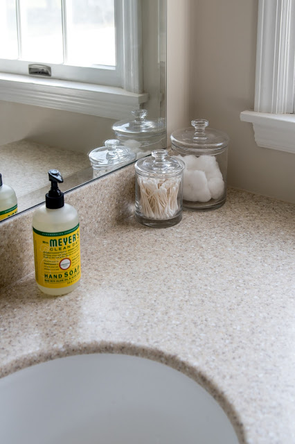 In between big cleanings, I have some wipes underneath the sink that I use to wipe down the counters and sinks... makeup and toothpaste can quickly make a recently cleaned bathroom look disgusting! We also wipe down our glass shower door/wall with a squeegee after every shower. It makes a huge difference!