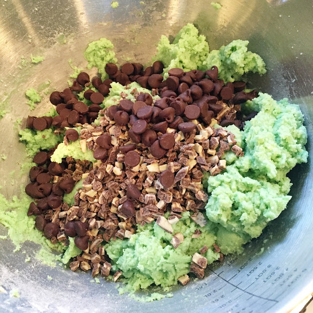 4. Add in chopped mints and chocolate chips, mixing briefly on low until incorporated through.