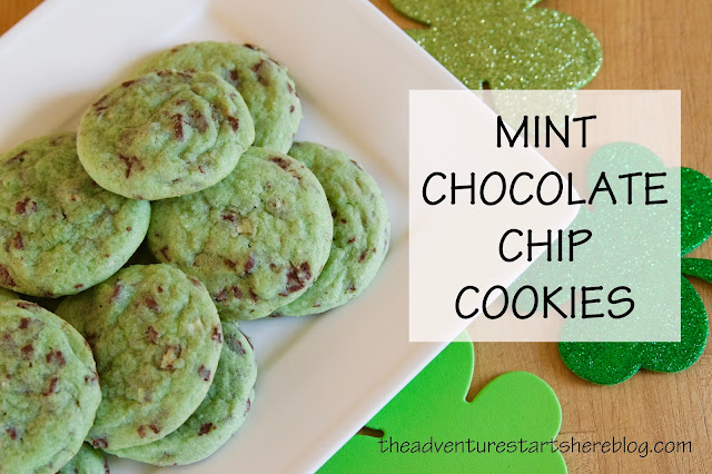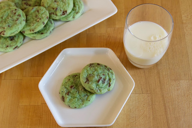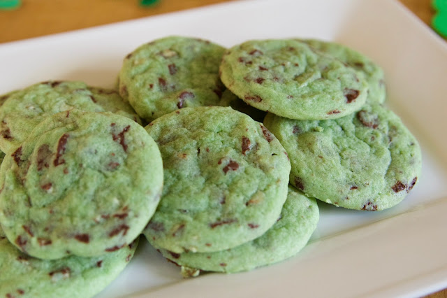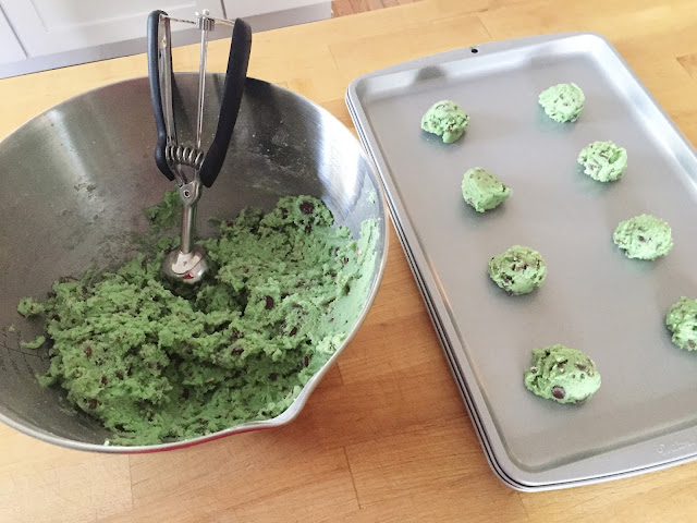 Happy March 1st! You know what that means??? We are officially in the month of St. Patrick's Day! While technically Easter is in March this year too, I'm going to be diplomatic and give the first half of the month to all things green, and spend the last half focusing on bunnies, eggs, and Jesus. So to get in the Irish spirit, I decided to whip up some Mint Chocolate Chip Cookies. I'm a huge fan of mint (ice cream, candies, chocolate, etc) and Noah thought it was pretty cool to make green cookies!