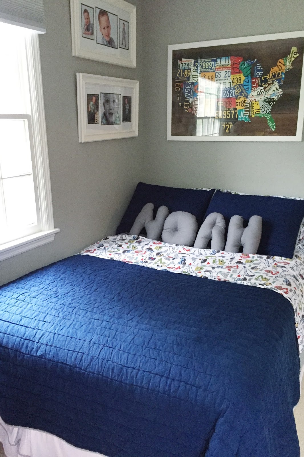 Recently, I shared how I'm a stickler for a made bed. While I love a made bed, I might make it slightly different than other people do. I always fold the top sheet and comforter down, making it easy to get in and out of it when sleeping. I also like the printed sheets to show to add some extra color. I was thrilled when a good friend of mine told me she has started making and selling these name pillows (among other things) at ParkPlaceGallery on Etsy. She asked the the colors in Noah's bedding and made these gray (with navy backing) NOAH pillows. I really love how they look on his bed! You should totally check out her website... next up I want the Ninja Turtle cardboard letters!