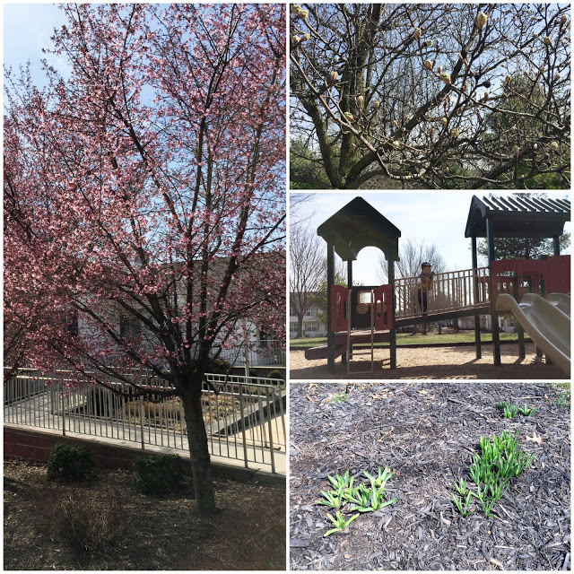 After going away on a tropical vacation, it was a little bit of a let down to come back to chilly and rainy weather (especially when it was in the 70s in NJ when we were away!). Thankfully, we got another taste of Spring when it hit 60 degrees this week. We took advantage of it and went for a walk to our neighborhood playground. Noah got to ride his Ninja Turtle trike and I got to check out the new buds. I'm excited that the flowers in our front yard are starting to poke out, but I have serious flower envy with my neighbors fully bloomed daffodils. I think I may have to go talk to her and find out how she does it!