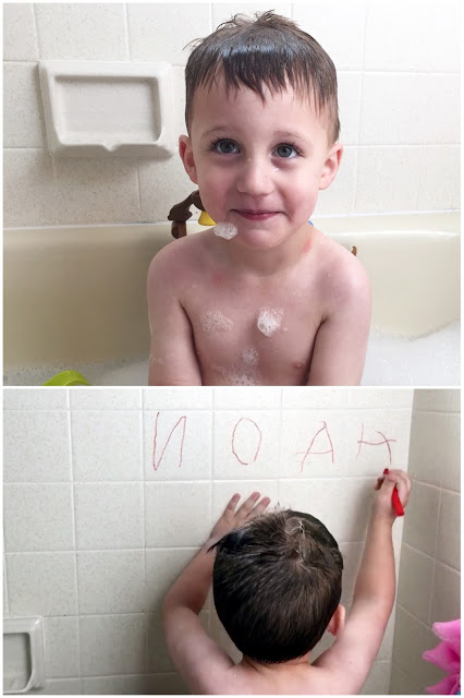 Noah has recently become a huge fan of bubble baths. He was going through a phase where he preferred showers, but now he is back to loving baths and wants "lots of bubbles" every time. Chris is usually the one to give Noah his bath, but recently I've started giving him a few too. He plays with his Paw Patrol bath squirters and loves using his bath crayons (both would be perfect in an Easter basket) on the tile wall. He surprised me this week when he wrote his name all on his own! Not only was I impressed that he knew how to spell it (without prompting), but that he could write all the letters himself. He started writing his name with his left hand and switched to his right hand for the H. I guess I have an ambidextrous kid on my hands ;)