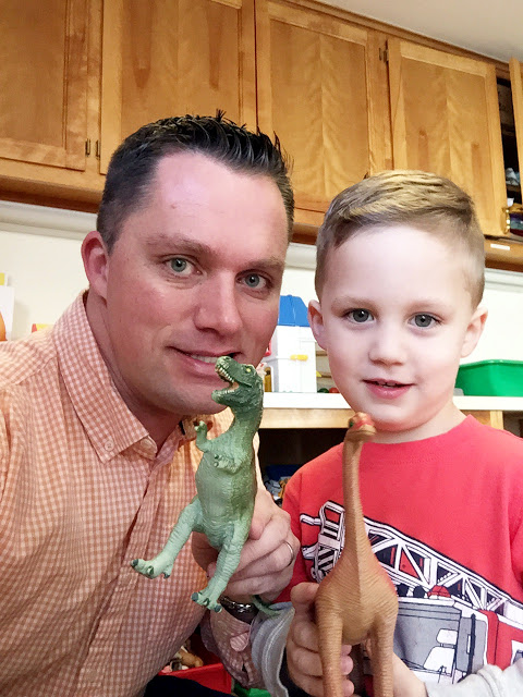 About two weeks ago, Noah's school had a "Daddy Day". Noah took Chris into school with him on a Saturday morning for 45 minutes. The kids were able to show their dads around the classroom and what they enjoy doing at school. Of course Noah showed Chris the dinosaurs. Apparently Noah carries this brontosaurus around EVERYWHERE... he even sits next to him during craft time :) The boys got some nice one on one time while I got to have a long and peaceful shower!