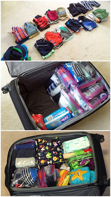I find the gallon size work best. I know some people swear by packing an outfit a day in each bag, and while that would work well if we were going somewhere where we'd be wearing one outfit a day, it wasn't going to work for our beach vacation. Instead, I layed out all of Noah's clothes for the trip - swim suits & rash guards, dressier outfits for dinners, lots of casual shorts and t-shirts, and pajamas. Once I knew that I had enough outfits for each day and occasion, I then rolled each outfit up and stuck them in a ziplock bag. I grouped like outfits together (swim suits, dinner, and casual). That way, I could take out the appropriate bag each day and let Noah choose which one he wanted to wear (he's actually pretty picky). The best part is that at the end of the trip, I could put the dirty clothes (and wet bathing suits) back in the ziplock bags and keep the clean clothes that he didn't end up wearing in a separate bag. It made doing laundry when we got back home so much easier. Another perk to storing them in plastic bags, is that it ensured they stayed clean from the beach toys and swim float I had to pack :)