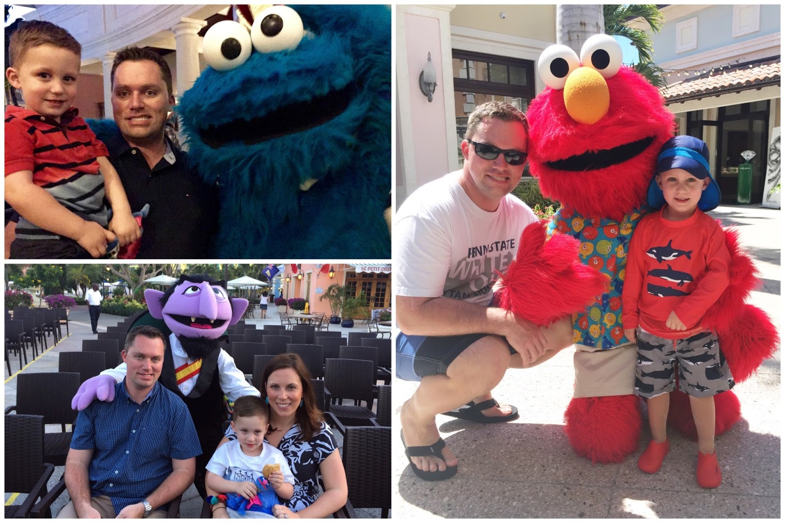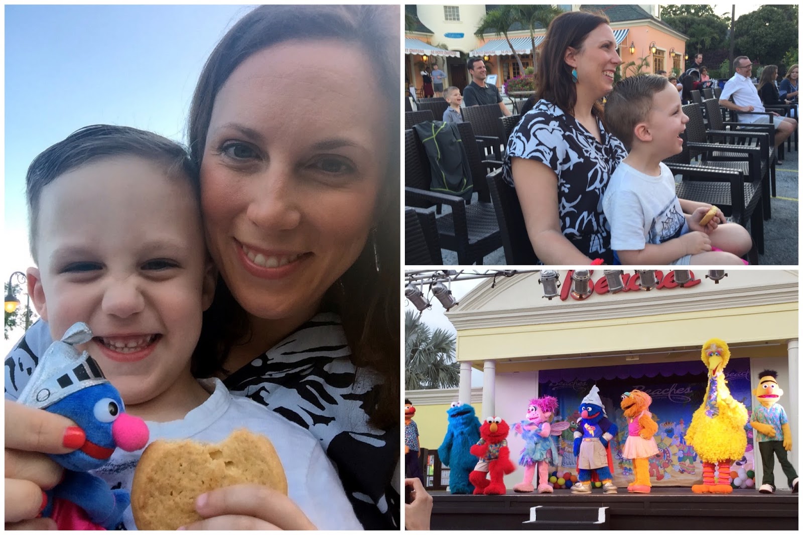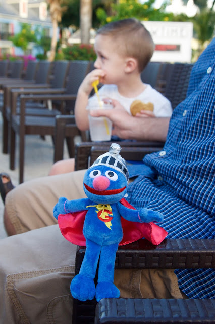 After spending so much time in the sun, Noah was ready for a nap around 2pm. One day we all needed a nap, but the other days it was nice to have the walkout so we could sit outside while Noah snoozed. Then it was time to shower and get ready for dinner (more on the food tomorrow) and some Sesame Street entertainment. On our first night, there was a Sesame Street parade. We got a seat super early expecting it to be crowded like at Sesame Place. It was much more low key at the resort and wasn't really necessary to arrive early. Same went for the show we saw later in the week. Seeing the Sesame characters walking around the resort was definitely an added bonus to our vacation :)