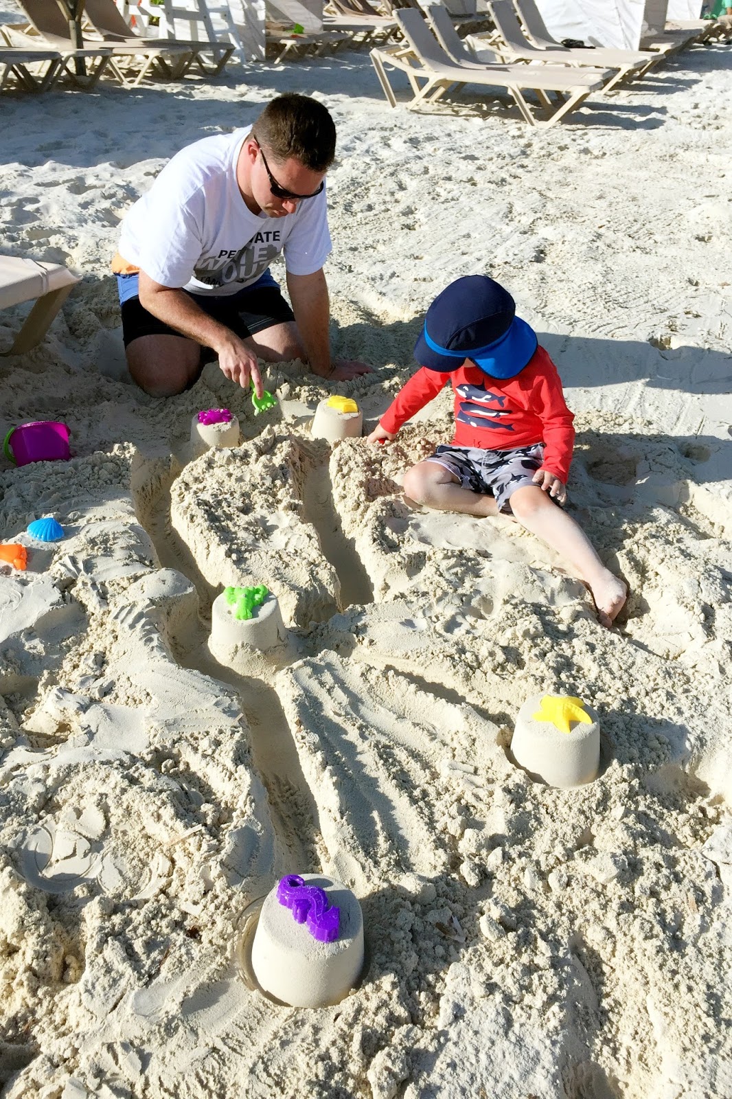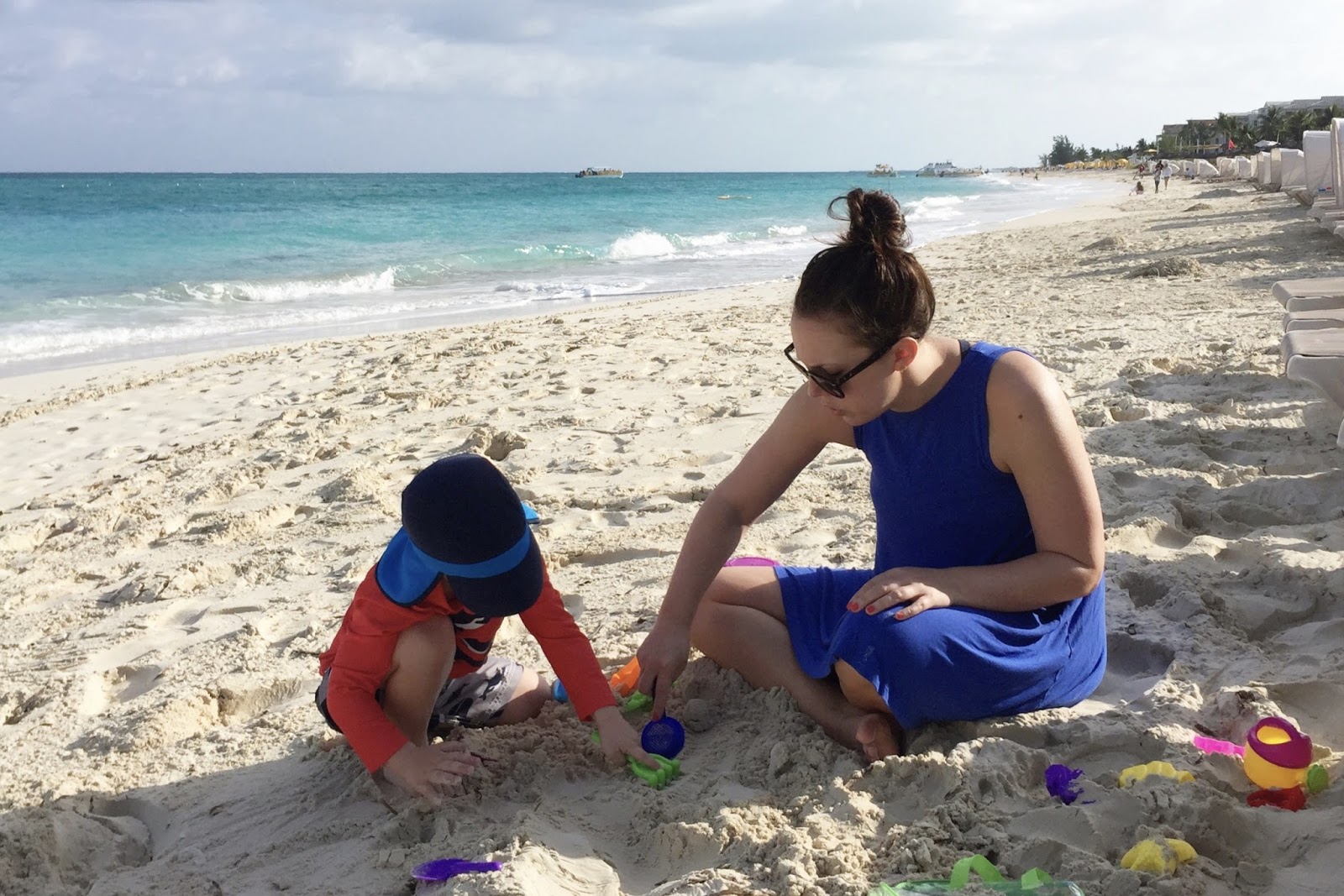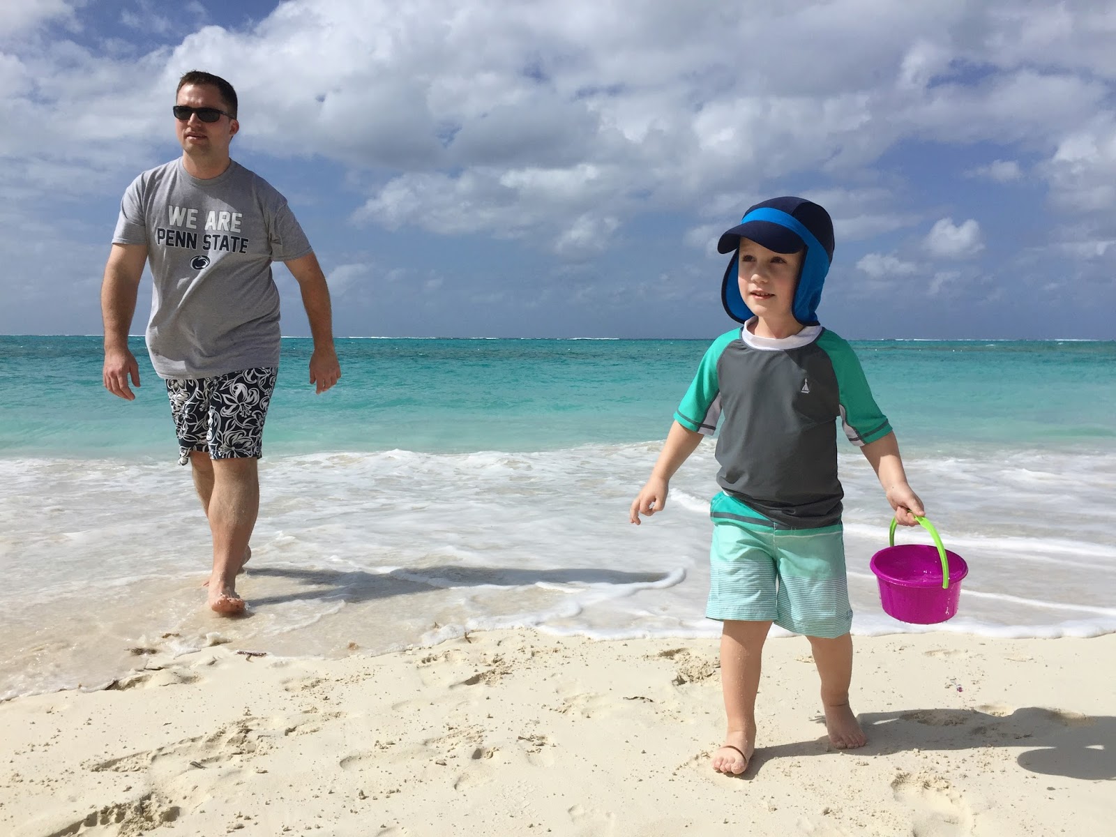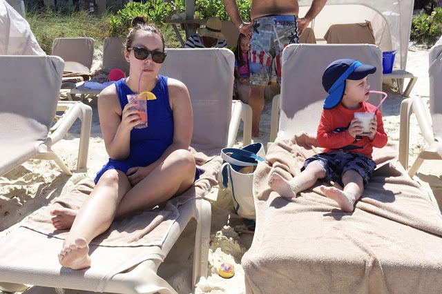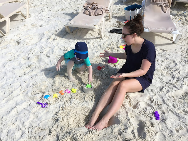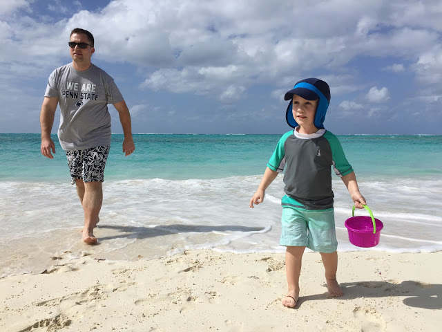 First up, the beaches... the beaches in Turks & Caicos are beautiful! The sand is soft and beautiful and the water is such a pretty turquoise color. For the 5 days we were there, the weather was in the low 80s, a few clouds in the sky, and the perfect amount of breeze that you never overheated. We still needed to wear hats and apply sunscreen, but we were able to stay on the beach almost all day without getting too hot. While I'm used to deeper beaches (more sand from when you walk on until you get to the actual water), it really wasn't an issue. We never had an issue finding a spot, and the short distance to the water made it easy for Noah to go back and forth and get buckets of water for his sand castles and holes. There was one spot of the beach that was nonexistent one morning because of high tide, but we simply walked a little further down and found the perfect (and quiet) spot. We learned that Noah is a total beach kid and preferred to spend our time there over the pool. Though when I asked him if he wanted to go to the beach, he'd say no... he wanted to go to the "sand" ;) Noah was content building sand castles and digging holes with Chris. I would go back and forth between playing with them, to relaxing and reading a book on my phone. It also didn't hurt that waiters would come around taking drink orders... we really got used to smoothies in the sand :)