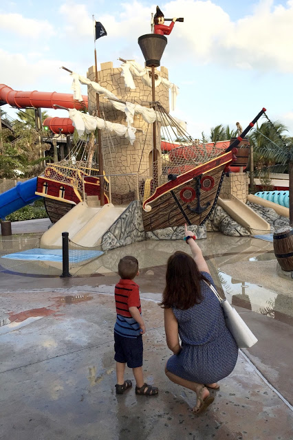 When planning the trip, I thought we would spend a lot of time at the water park. They had a pirate ship, a lazy river, and many water slides. We did go on the lazy river once, but Noah didn't want to go again... I don't think he liked going under the waterfall. While Noah loved going down the waterslides at Sesame Place, he was not interested in it this time. I can totally see him loving this section of the resort in a few years... we'll just have to go back ;)