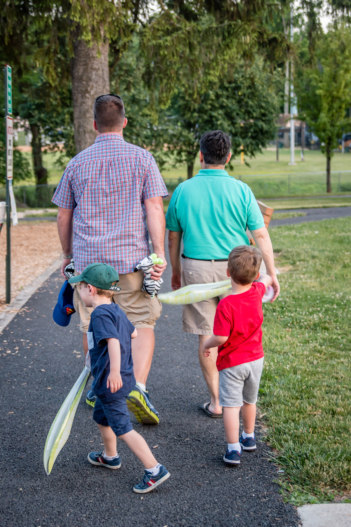 One of the most amusing parts of the evening was watching the dads "compete" at the different carnival games.  It started when Chris won Noah a stuffed zebra at the water gun game.   He then won a stuffed cookie monster for JP, the very next round!  While Chris will tell you that it's really rare for him to win, so far this summer, Chris has won 3 times!  On our way out, JP's dad decided to try his luck at the dunk a cop tank.  He was successful at dunking the cop, which led to Chris having to give it a try as well.  We finished the night with the men seeing who could throw a faster pitch.  While neither of them will be trying out for the majors, they did win the boys some inflatable swords ;)