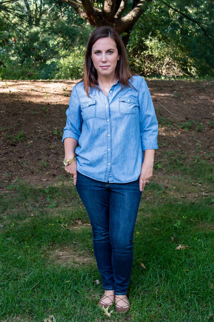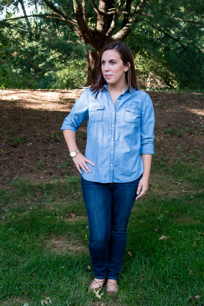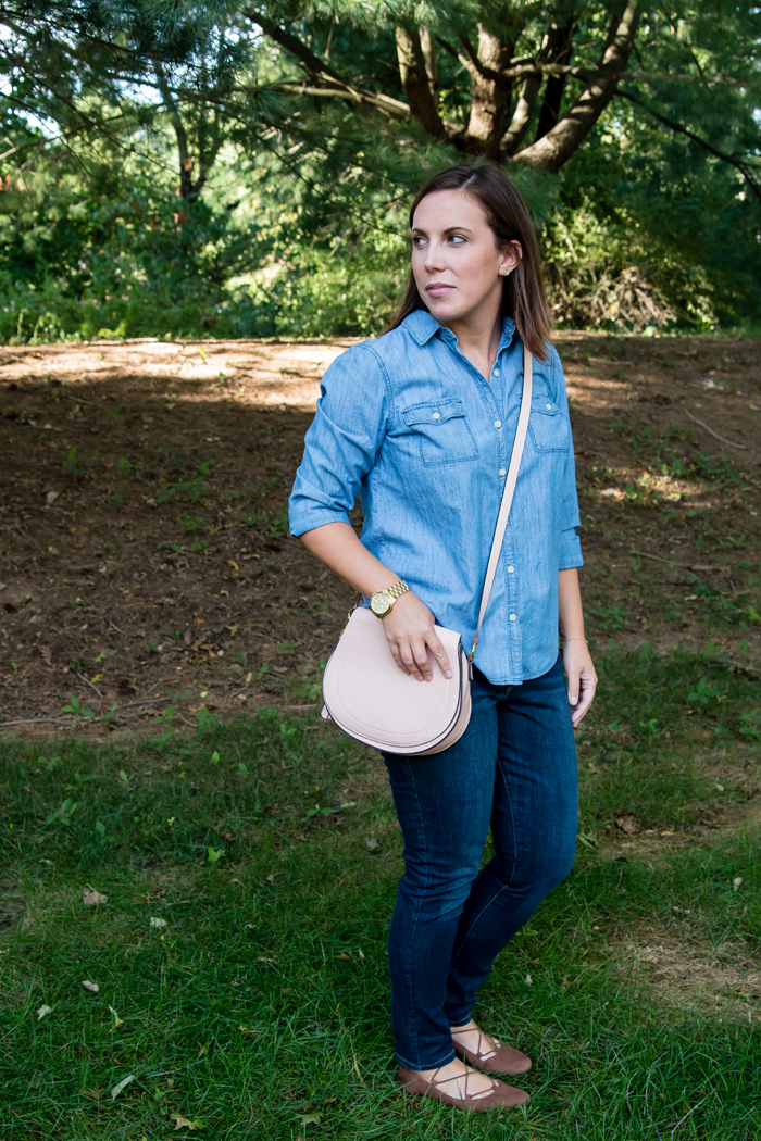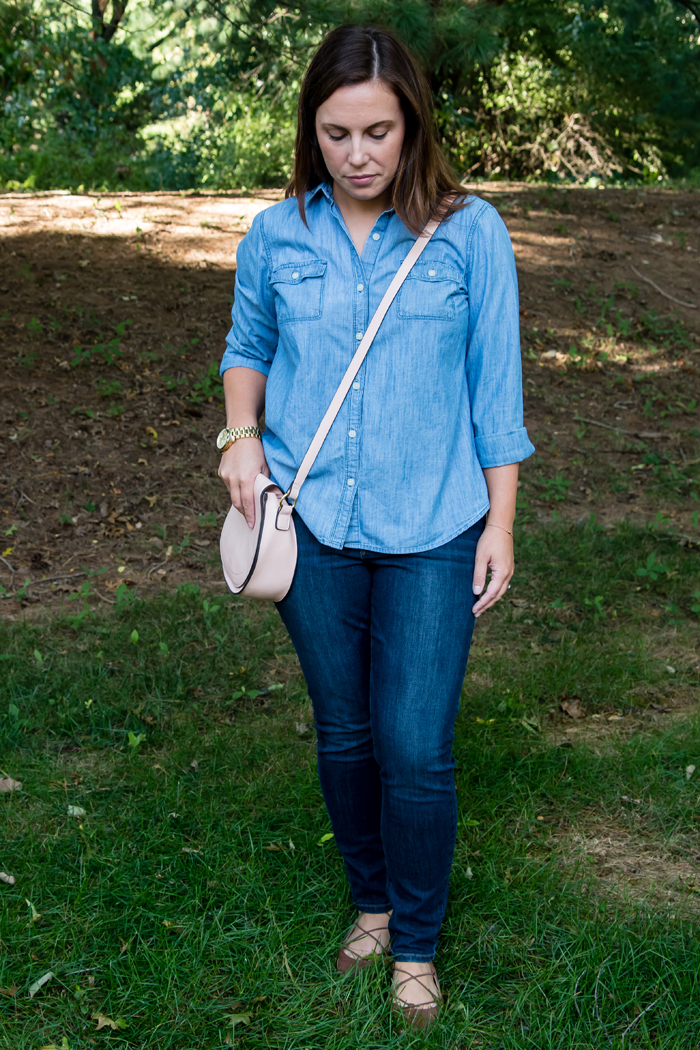 I love all of your chambray looks, especially this double denim look for fall! I love pairing my chambray with jeans and I love that you added those cute lace-up flats.